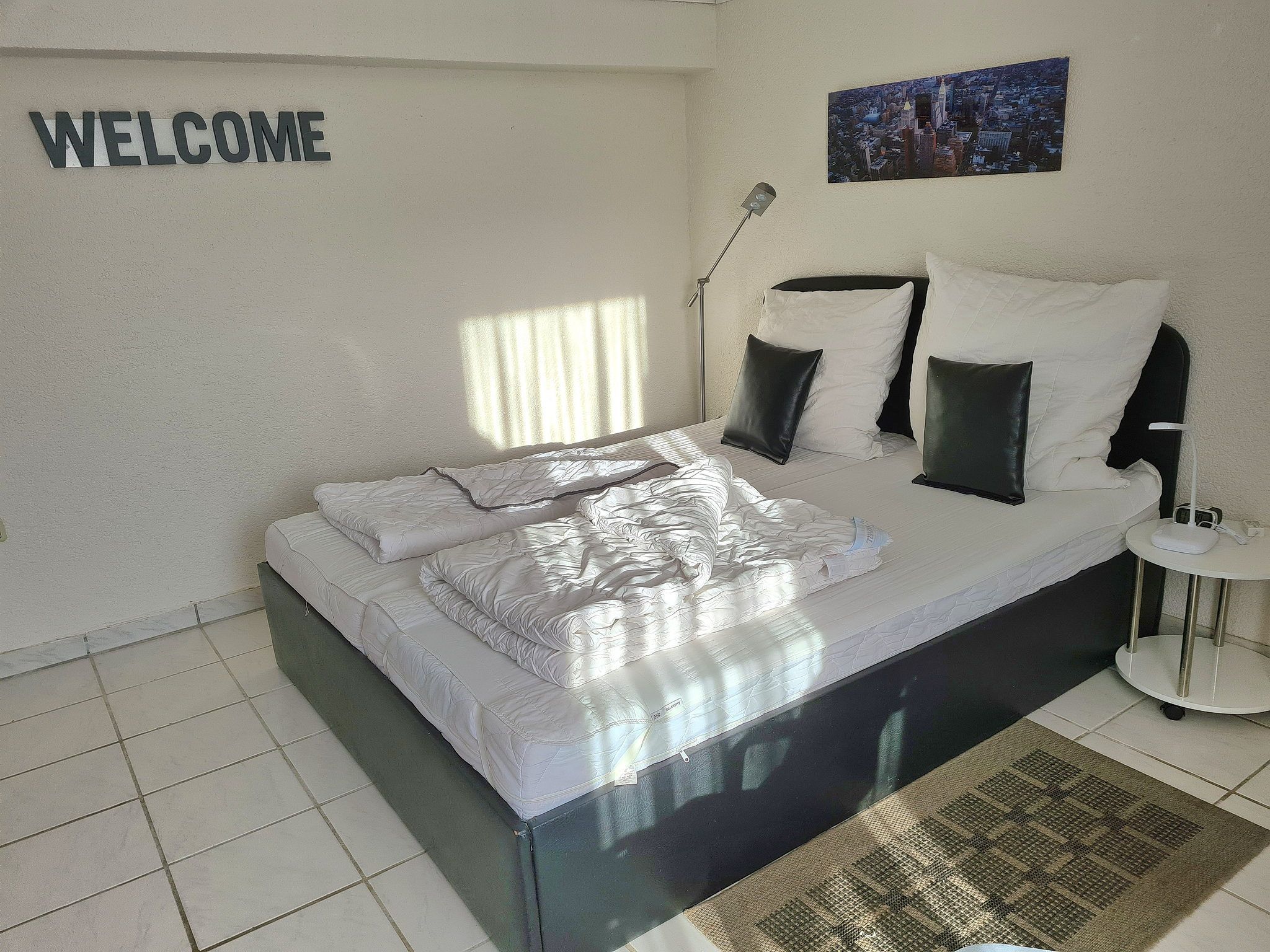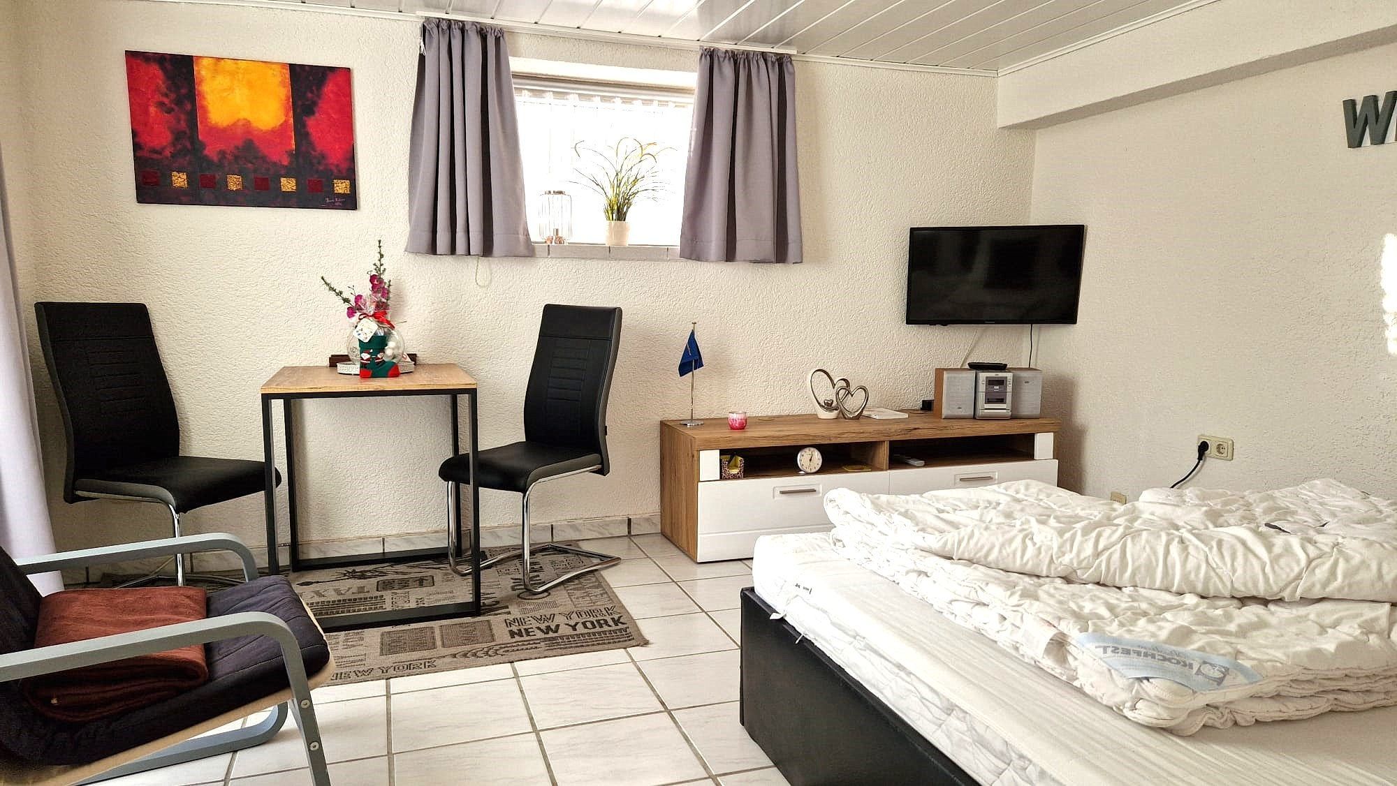 Helles, modern eingerichtetes Wohn/Schlafzimmer mit Doppelbett (2x 80x200 cm) , Kleiderschrank, Telefon, Radio, Sat-TV, gefliest.