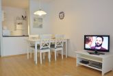 Helles, freundliches und modernes Wohn- und Esszimmer mit direktem Zugang zum großen Balkon. Das Wohn- und Esszimmer ist mit einer 3-er Couch und 2 Sesseln, einem Couchtisch, einer Kommode und einem Essplatz für 4 Personen ausgestattet. Ein Fernseher mit DVD-Player und eine Ministereoanlage mit CD-Player stehen zur Unterhaltung bereit. Das Wohn- und Esszimmer ist mit Laminatboden ausgelegt.