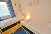 Freundliches Schlafzimmer mit Fenster zum Laubengang. Das Schlafzimmer ist mit 2 getrennten Betten (90x200cm) und einem Kleiderschrank ausgestattet. Ein weiterer Kleiderschrank befindet sich im Flur vor dem Bad. Das Schlafzimmer ist mit Laminatboden ausgelegt. Das Fenster zum Laubengang lässt sich durch einen Außenrollladen vollständig verdunkeln.