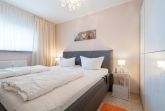 Modernes, gefliestes Schlafzimmer mit Polsterbett. Das Schlafzimmer ist mit einem Polster-Doppelbett (2x 90cm x 200cm) mit verstellbarem Lattenrost (Kopf- und Fußteil), 2 Nachttischen und einem Kleiderschrank ausgestattet. Das Fenster zum Laubengang lässt sich durch einen Außenrolladen und einer Gardine verdunkeln.
