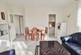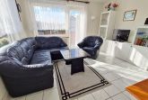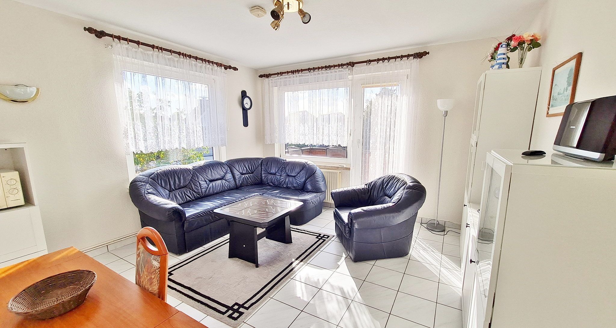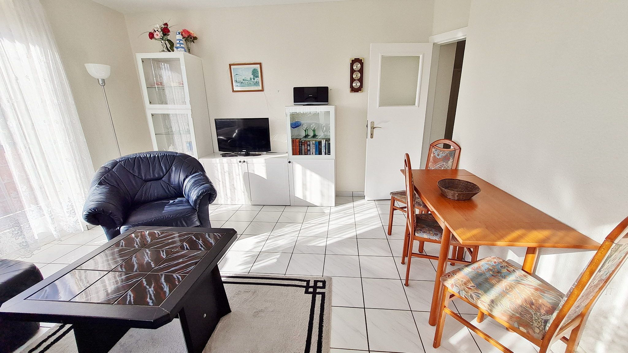 Gefliestes Wohn- und Esszimmer mit direktem Zugang zum Balkon. Das Wohn- und Esszimmer ist mit einem Essplatz für max. 3 Personen, einer Ledercouch (Schlafcouch 120x165cm), einem Sessel, einem Couchtisch und einem Wohnzimmerschrank ausgestattet. Zur Unterhaltung stehen ein Fernseher und ein Kofferradio zur Verfügung.
