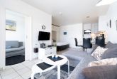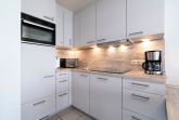Moderne, neue, komplett eingerichtete, zum Wohnbereich offene Küche mit einem 4-Platten Cerankochfeld, einer Spülmaschine, Backofen, Kühlschrank mit kleinem 3-Sterne Gefrierfach, Mikrowelle, Kaffeemaschine, Toaster und Wasserkocher.