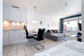 Eine begrenzte Parkmöglichkeit steht am Haus zur Verfügung. Münzwaschmaschinen, Trockner, Aufzug sowie ein Fahrradraum im Haus. Balkon in östliche Richtung mit seitlichem Blick auf die Ostsee.