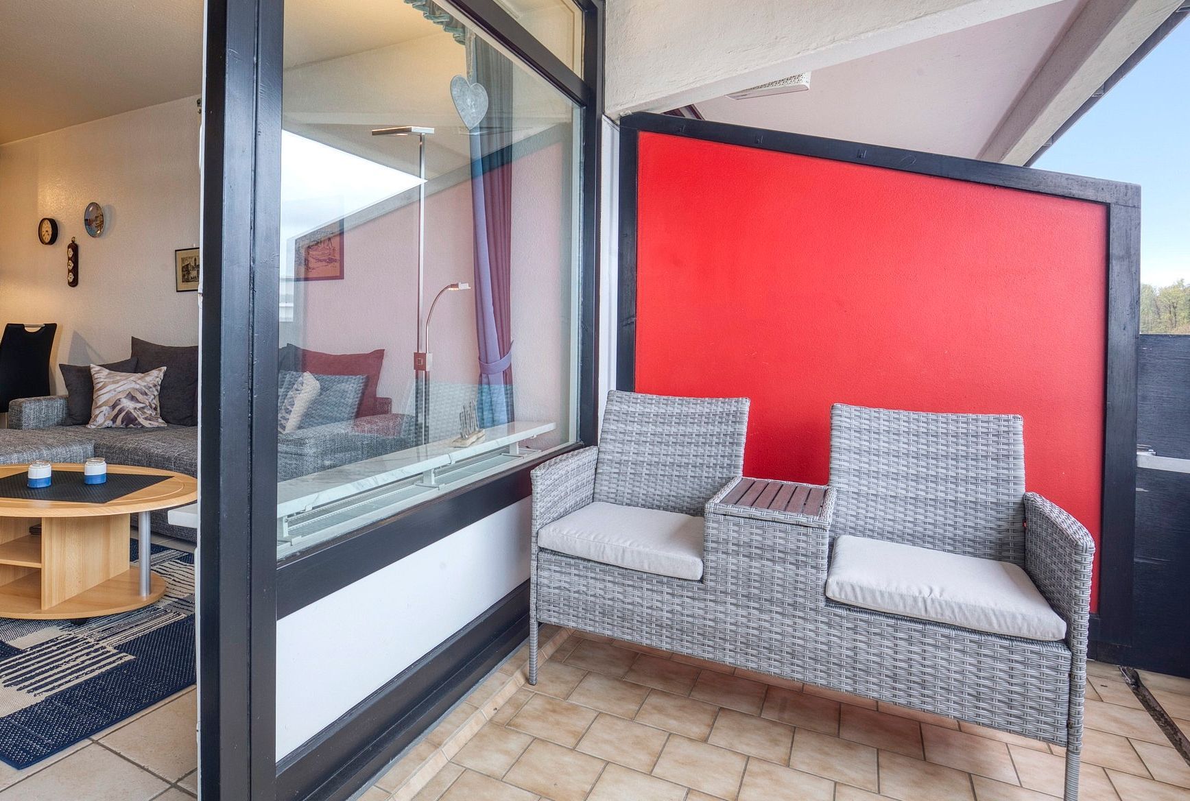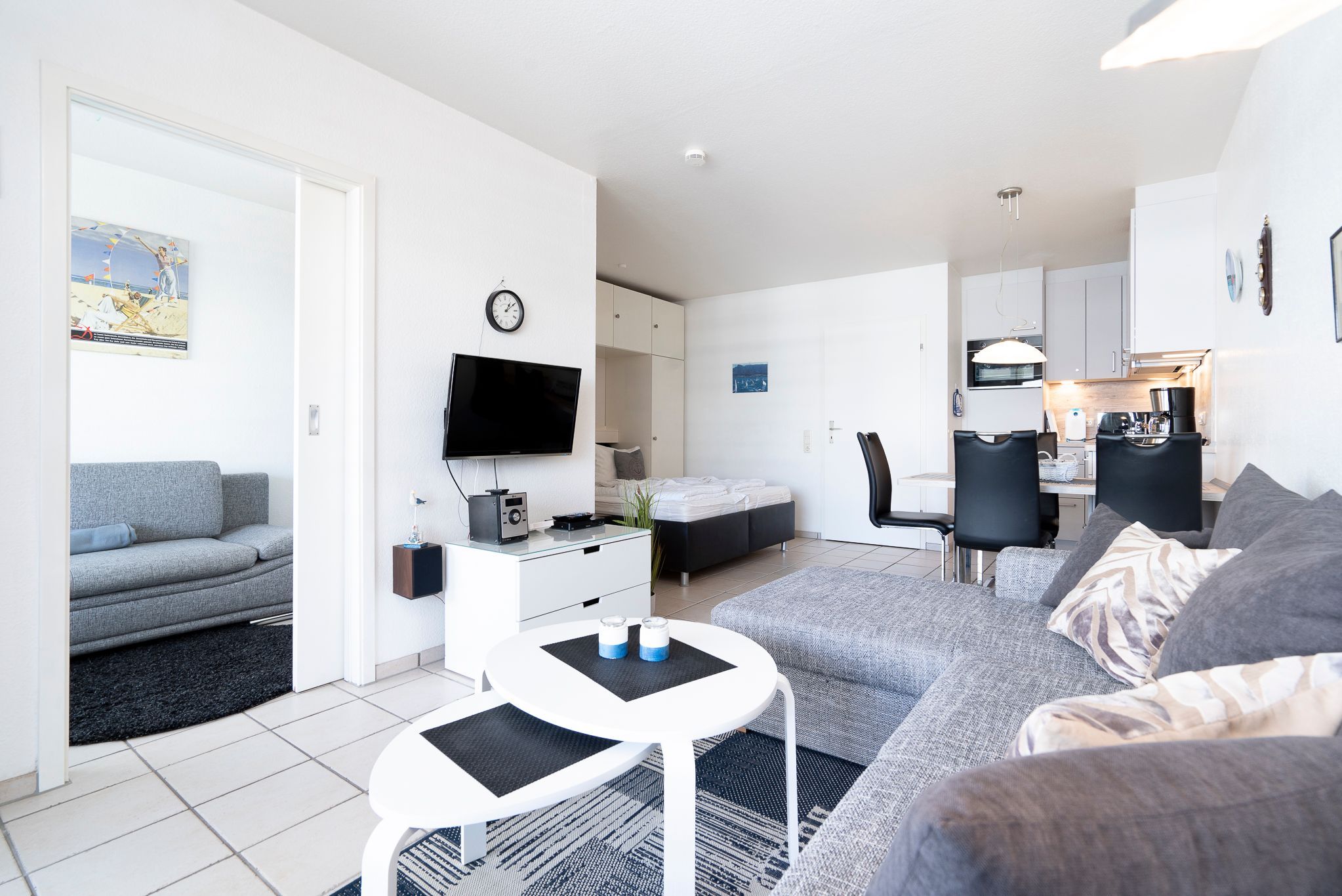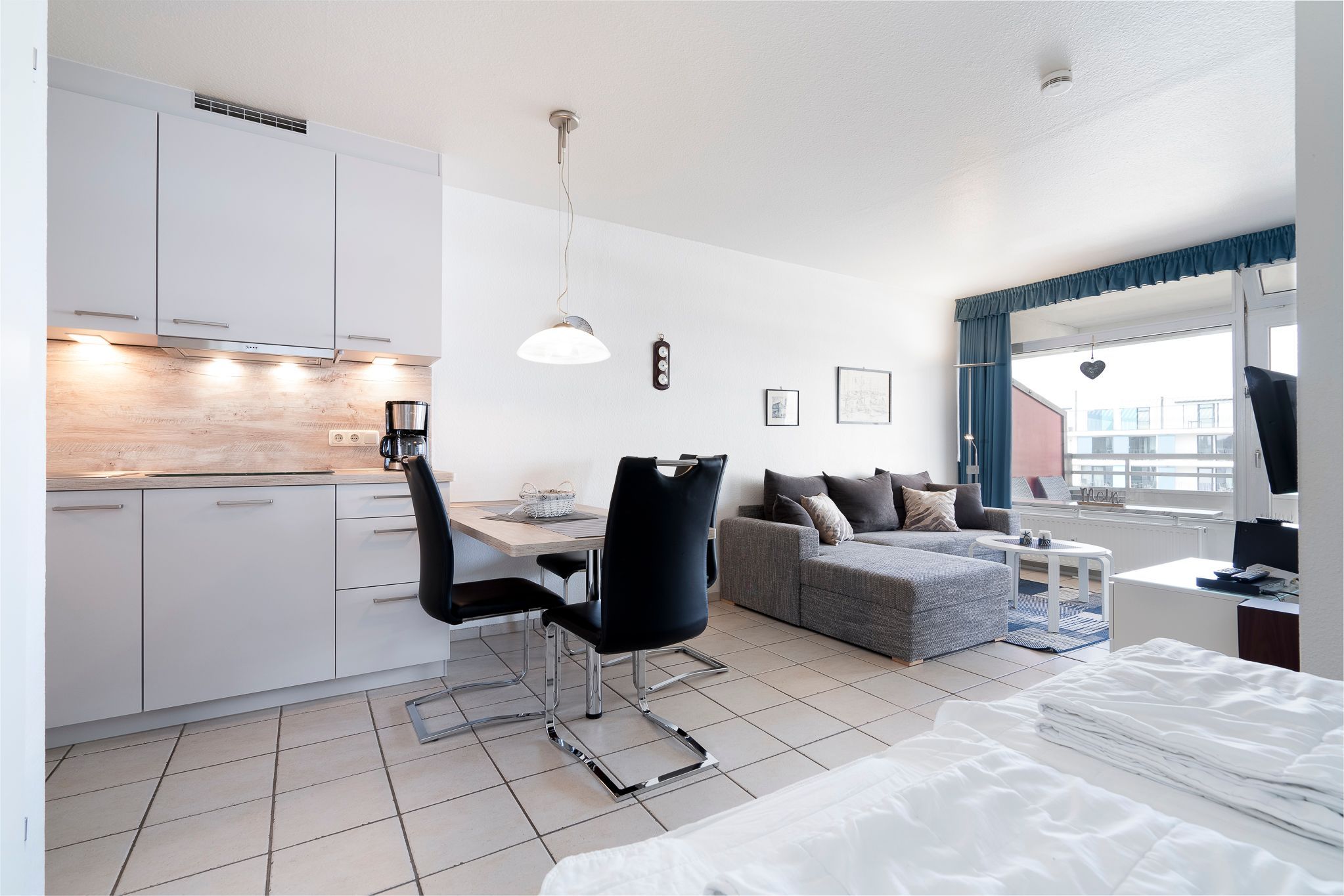 Moderner Wohn- und Schlafbereich mit Essplatz für 4 Personen. Der Wohn- und Schlafbereich ist mit einem Doppelbett (2x 80x200cm), 2 kleinen Kleiderschränken, einer Eckcouch und einem Couchtisch ausgestattet. Vom Wohnbereich besteht ein direkter Zugang zum Balkon. Zur Unterhaltung stehen ein Flachbild-Fernseher, ein DVD-Player und eine Mini-Stereoanlage mit CD-Player zur Verfügung. Der Wohn- und Schlafbereich ist gefliest. Die Fenster und die Tür lassen sich durch einen Vorhang blickdicht verdunkeln.