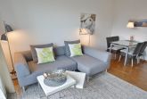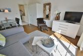 Modern ausgestattetes Wohn- und Esszimmer mit direktem Zugang zur Terrasse in südliche Richtung. Das Wohn- und Esszimmer ist mit einer Couch, einem Sessel, einem Couchtisch einer Kommode, einem Essplatz für 4 Personen und einem Kleiderschrank ausgestattet. Zur Unterhaltung stehen ein Flachbildfernseher und eine Mini-Stereoanlage mit CD-Player zur Verfügung. Das Wohn- und Esszimmer ist mit Designer-Planken ausgelegt.