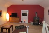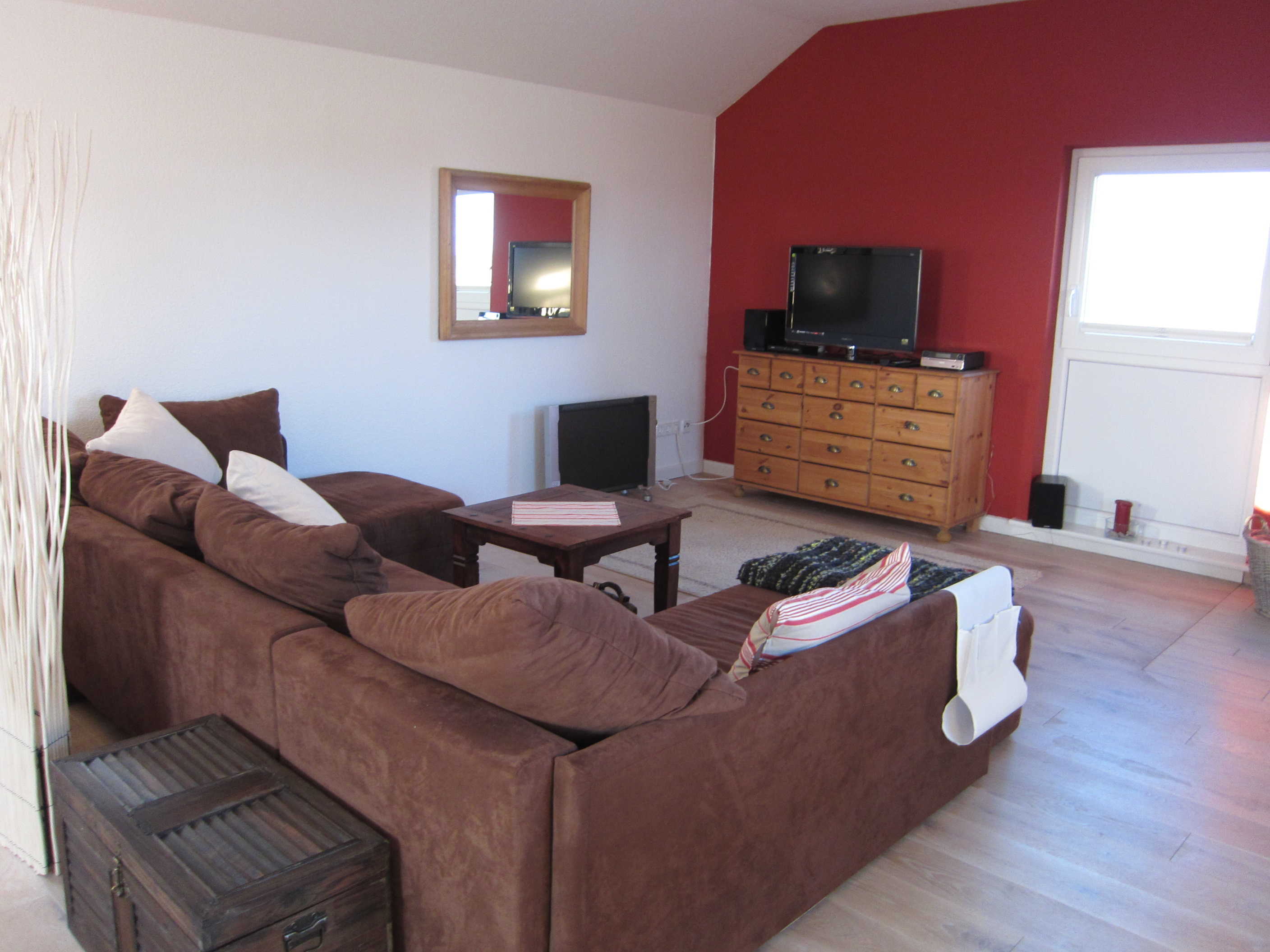 Der großzügige und lichtdurchflutete Wohn-Schlafraum ist unterteilt durch einen Sichtschuz und bietet ein stilvoll eingebautes Doppelbett (Liegefläche: 160 x 200 cm, 2 Matratzen à 80 cm Breite) sowie einen außergewöhnlich freundlich und hochwertig eingerichteten Atelier-Wohnraum mit Massivholzfußboden, LED-SAT-TV, DVD, Stereo-Anlage mit iPod-Dockingstation, Radio, CD- und DVD-Player sowie eine schnelle WLAN-Verbindung. Das, ein heimeliger Ofen, sowie Bücher und Spiele tragen dazu bei, dass auch bei Schietwettertagen für Wohlbefinden und Unterhaltung zu Hause gesorgt ist. Ein Kinderbett sowie ein Kinderhochstuhl, Toilettenaufsatz und ein Trittschemel können zur Verfügung gestellt werden.