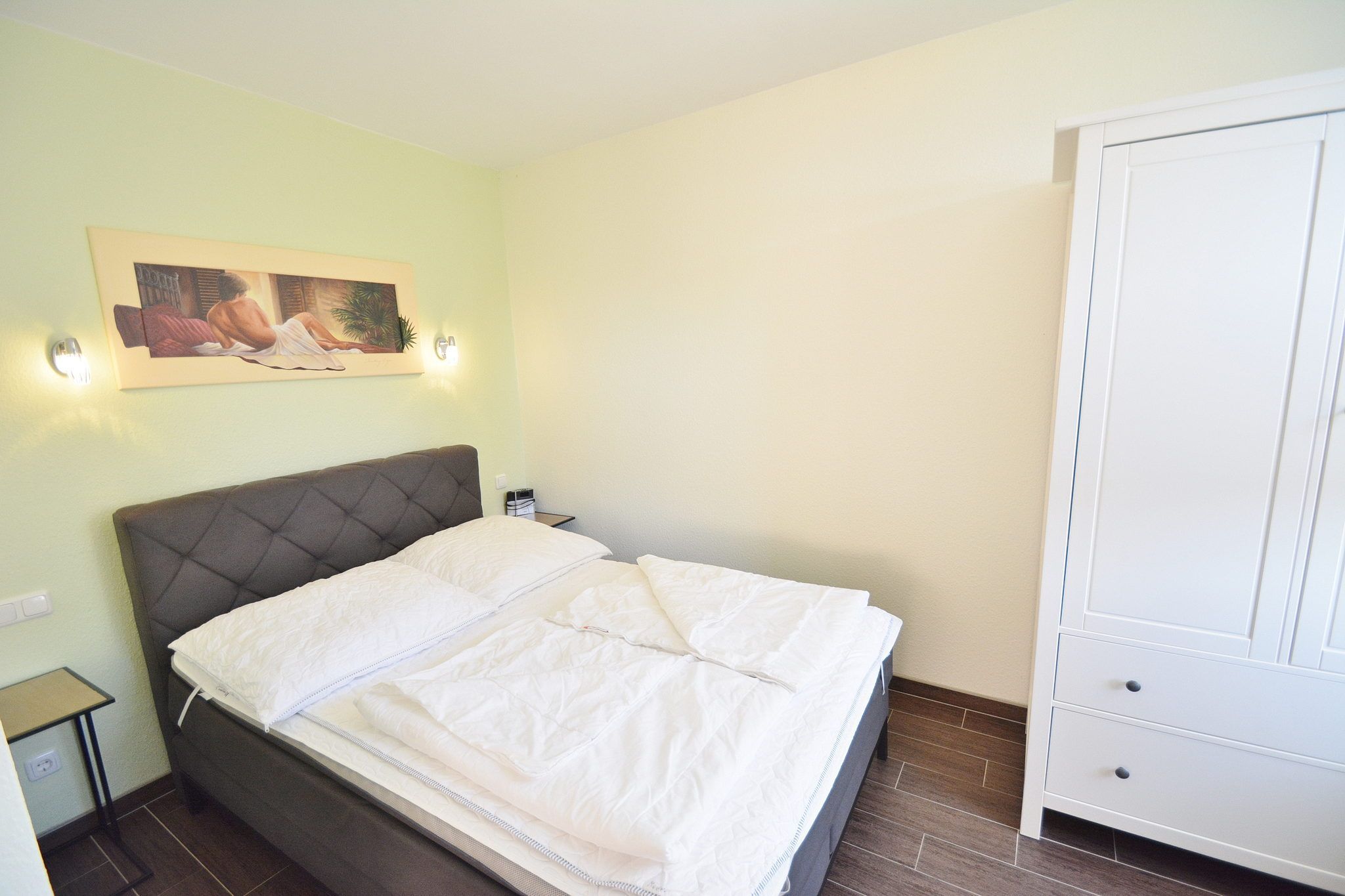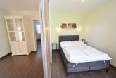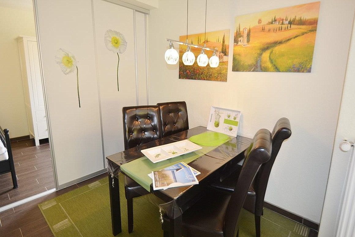 Modernes, großzügiges Wohn- und Esszimmer mit direktem Zugang zur Terrasse. Das geflieste Wohn- und Esszimmer ist mit einem Essplatz für 4 Personen, 2 Leder-Couchen, einem Couchtisch und einer Kommode ausgestattet. Zur Unterhaltung stehen ein Flachbildschirm und eine Mini-Stereoanlage zur Verfügung. Der moderne, geflieste Schlafbereich mit einem Boxspringbett (140x200cm) und einem Kleiderschrank ausgestattet, ist durch eine Vorhangsystem vom Wohnbereich getrennt. Das Fenster lässt sich durch ein Innenrollo etwas verdunkeln.