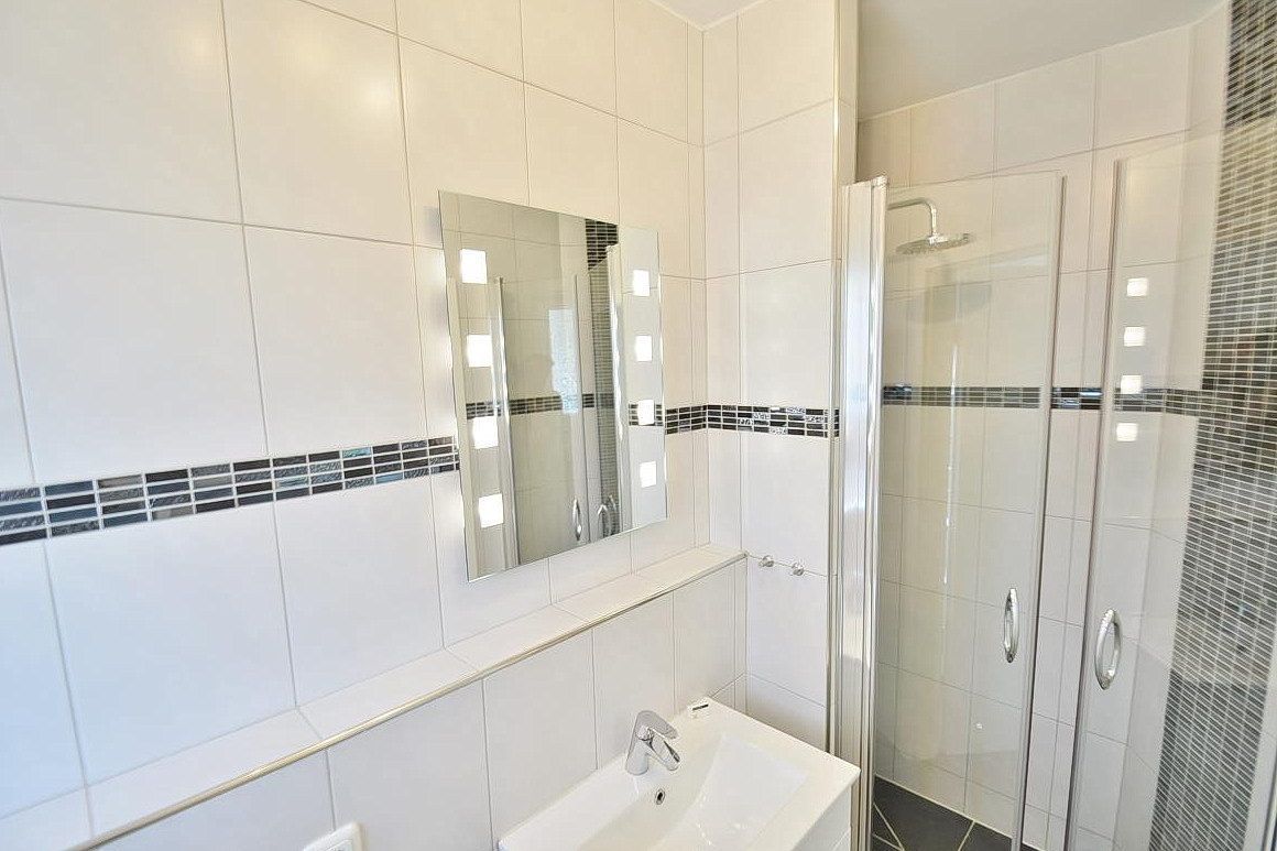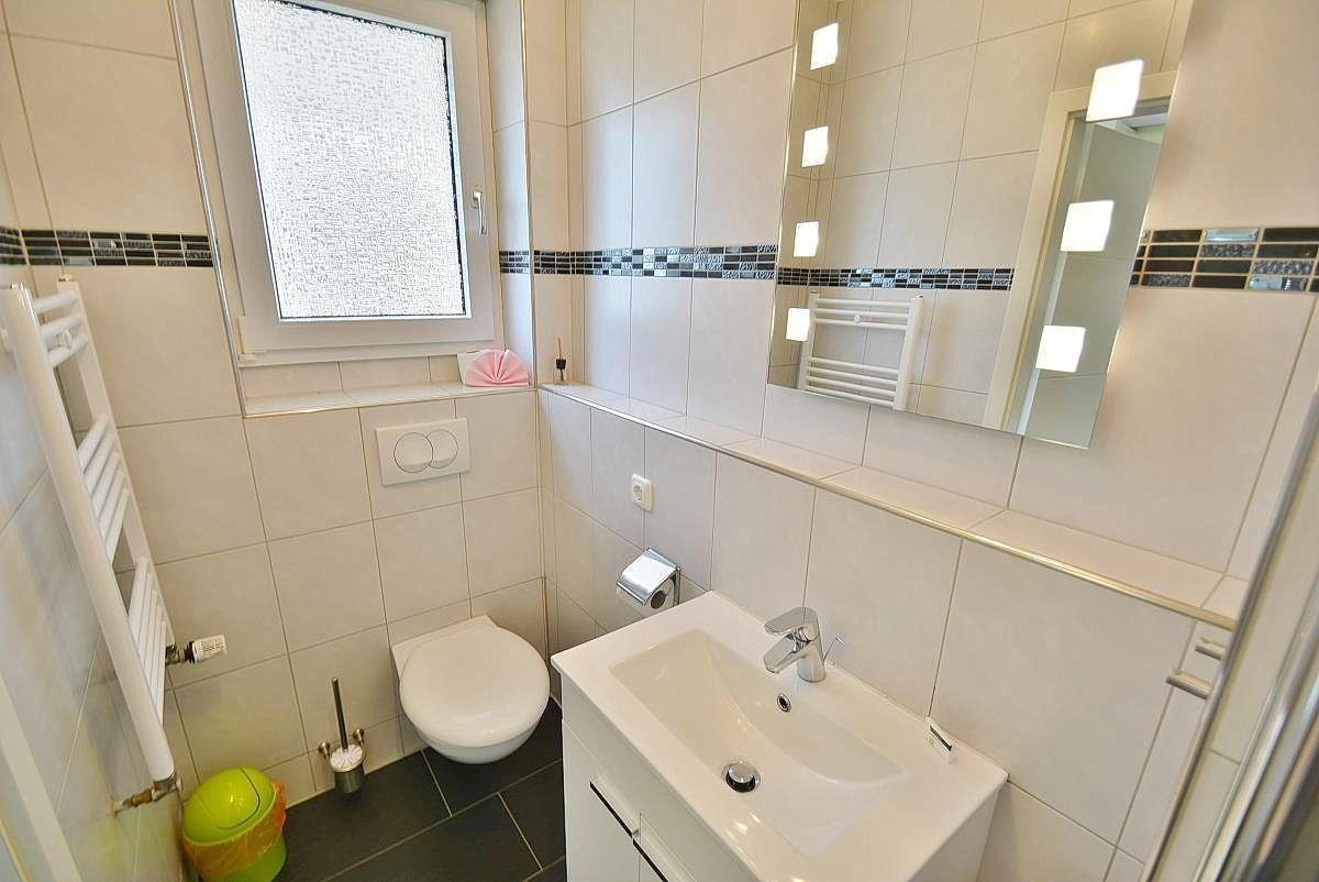 Modernes, helles Tageslichtbad mit Dusche, Waschbecken und Toilette.
