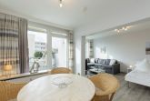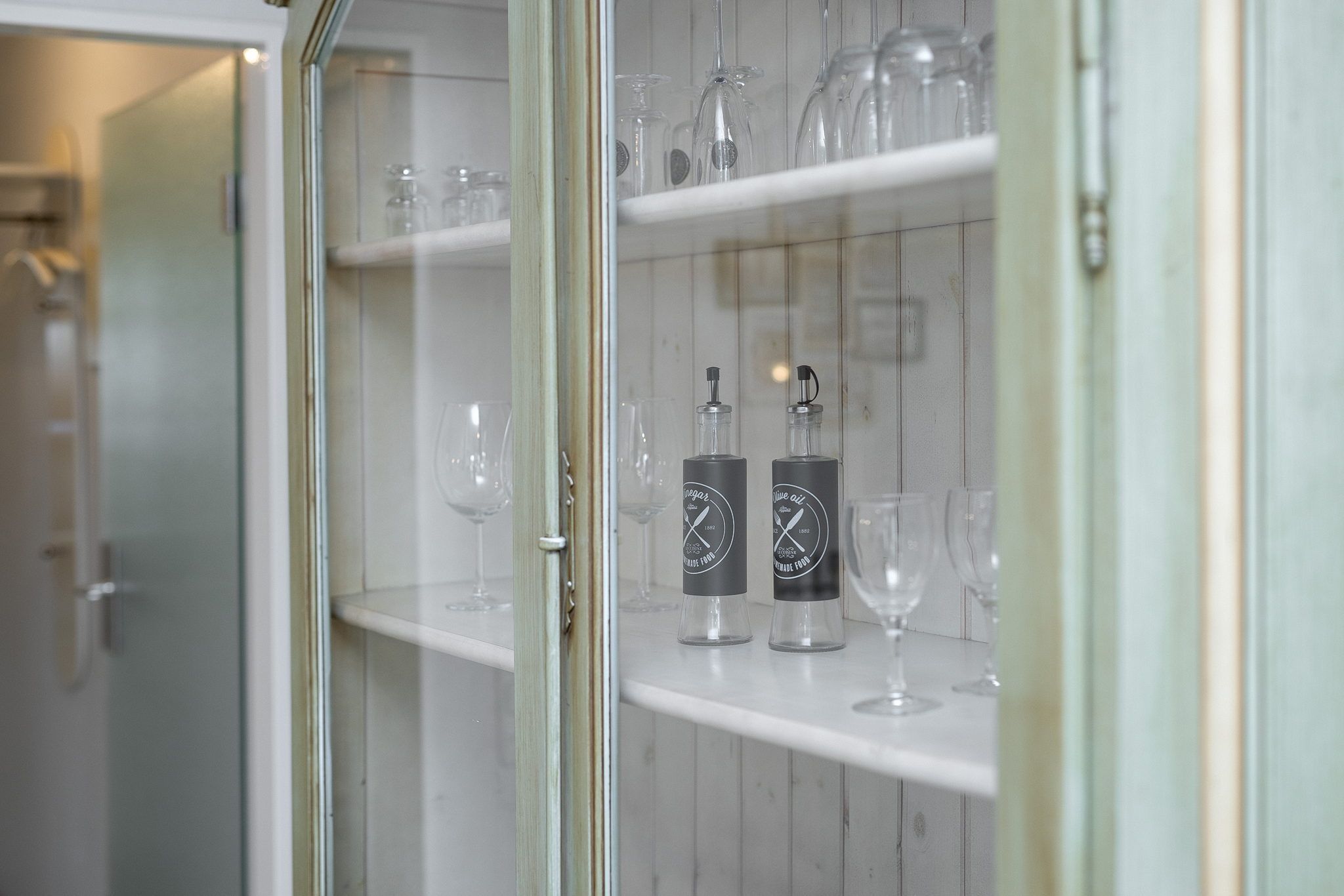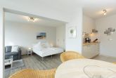 Zum Wohn-Schlafbereich offene komplett ausgestattete Küchenzeile mit 2-Platten Cerankochfeld, Spülmaschine, Kühlschrank mit kleinem Gefrierfach und Mikrowelle. Ebenso stehen eine Kaffeemaschine, ein Toaster und ein Wasserkocher zur Verfügung.