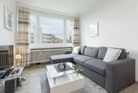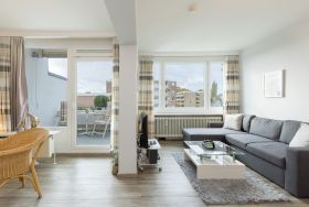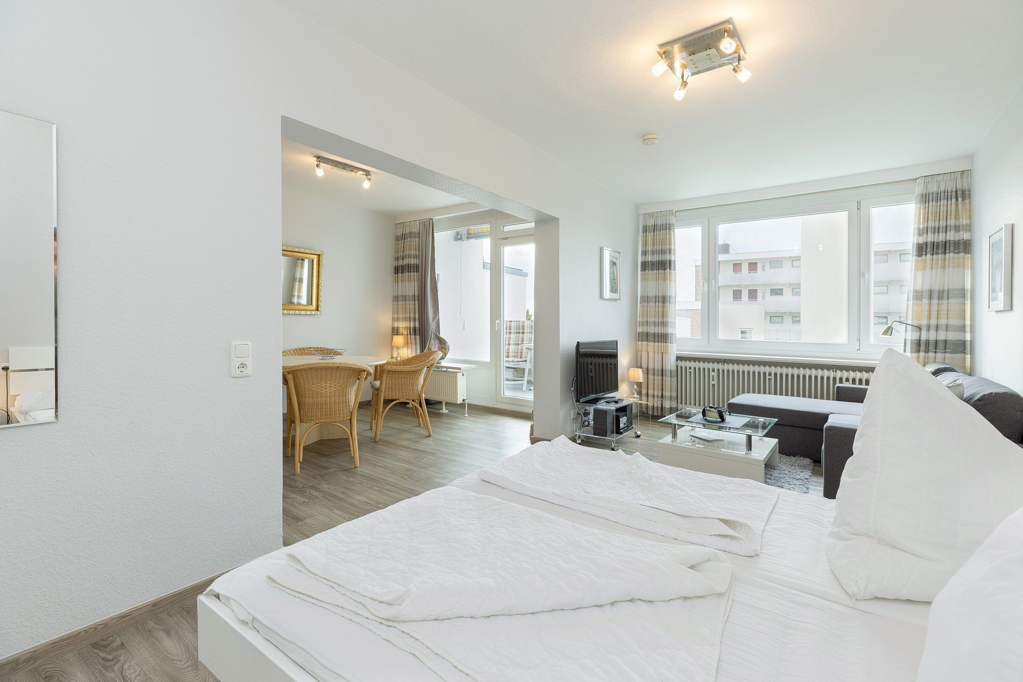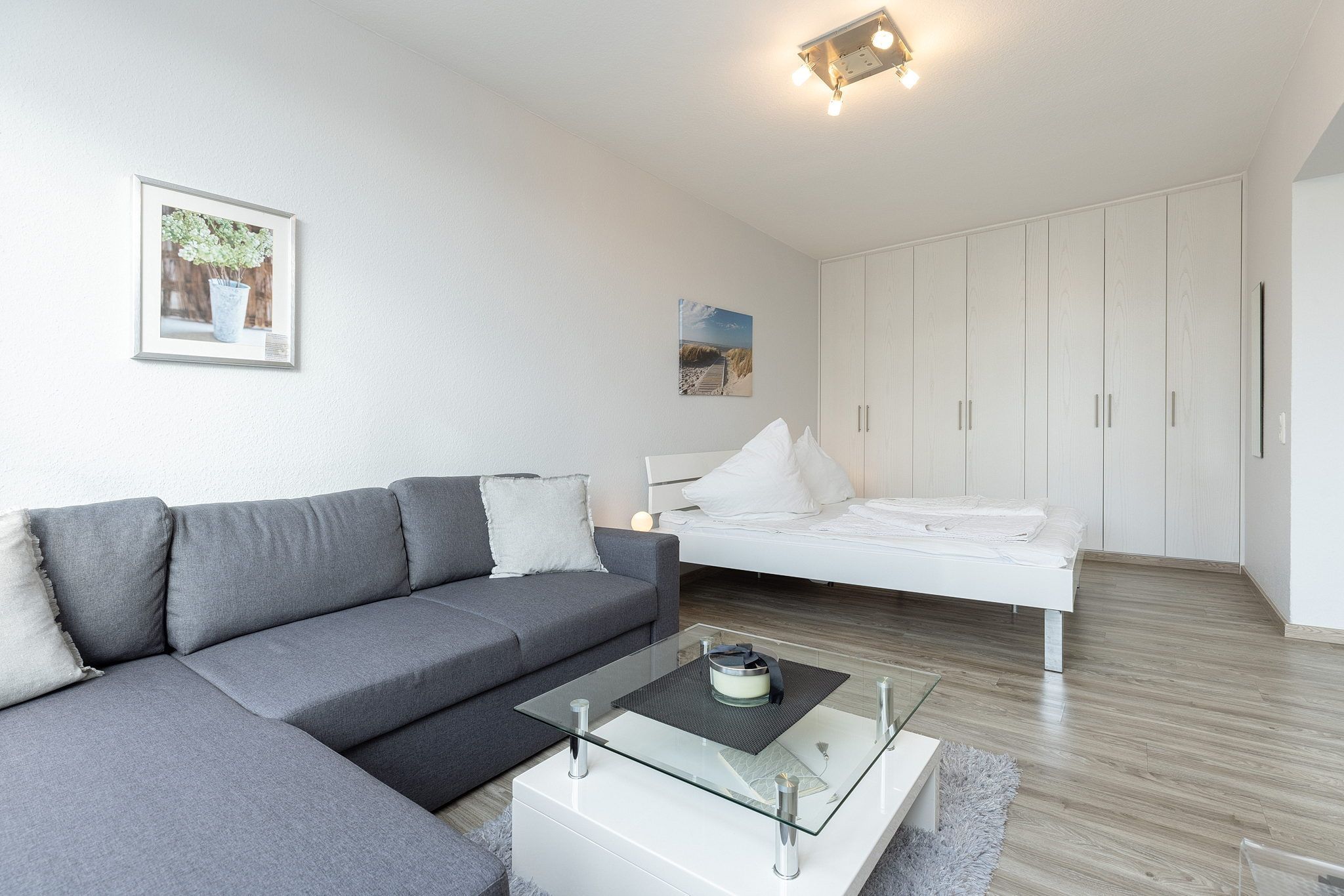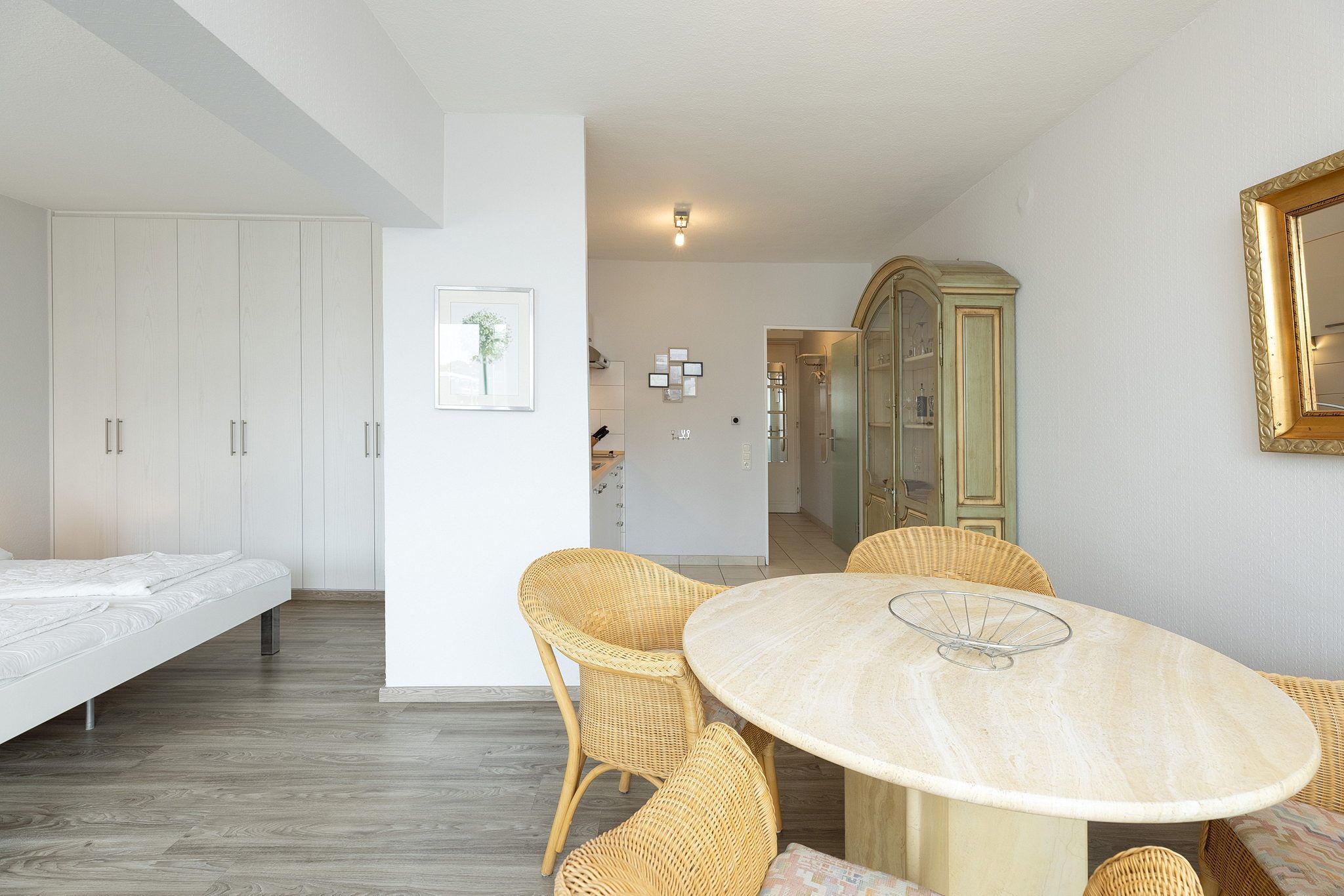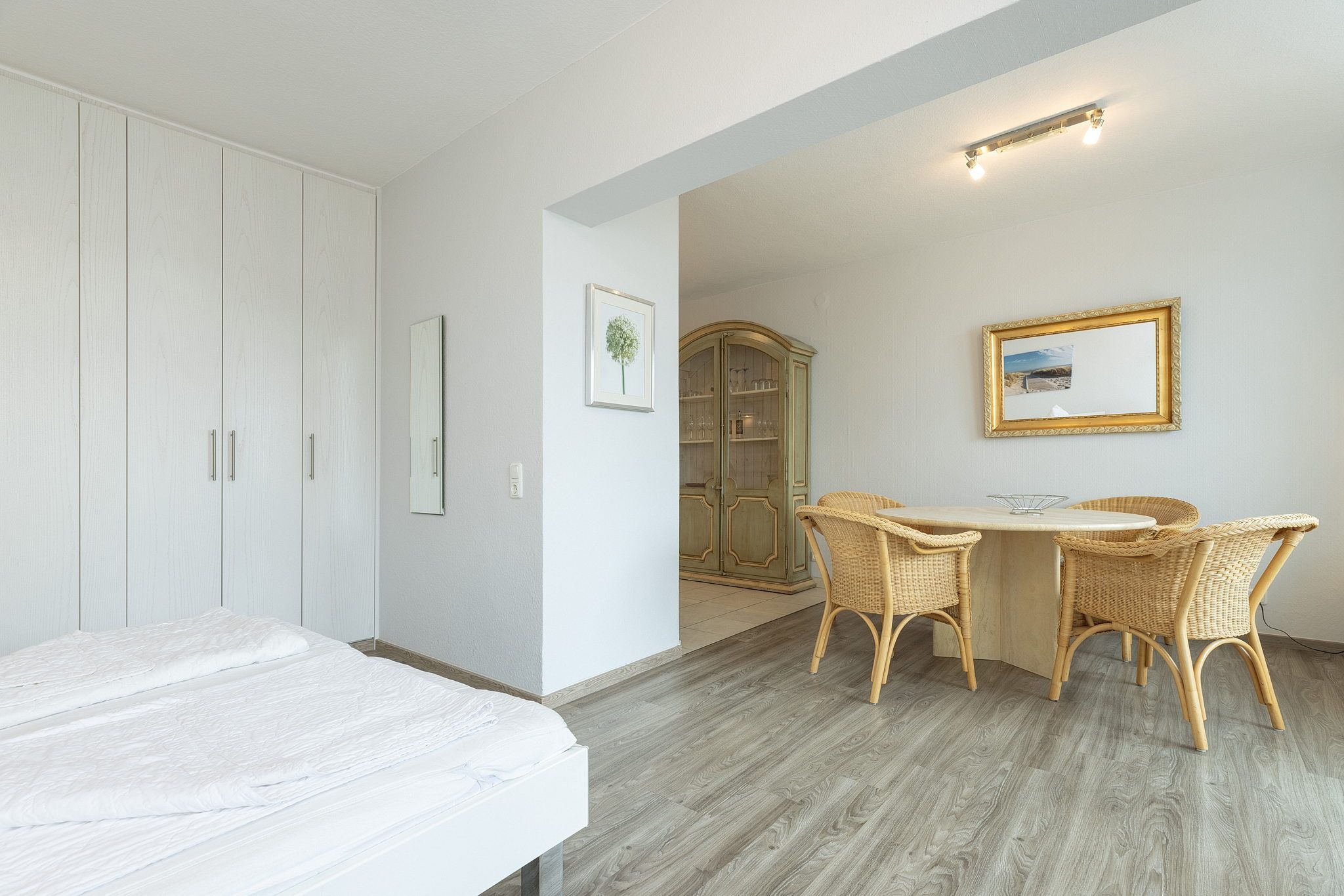 Großzügiger Wohn-Schlafbereich mit direktem Zugang zum schönen Balkon mit seitlichem Seeblick. Das Zimmer ist ausgestattet mit einem Doppelbett (2x80x200cm) und einem großen Kleiderschrank, einer Couch und einem Essplatz für 4 Personen. Zur Unterhaltung stehen ein Flachbild-TV und eine Mini-Stereoanlage zur Verfügung. Der Boden ist mit Laminat ausgelegt. Die Fenster lassen sich mit Vorhängen verdunkeln.
