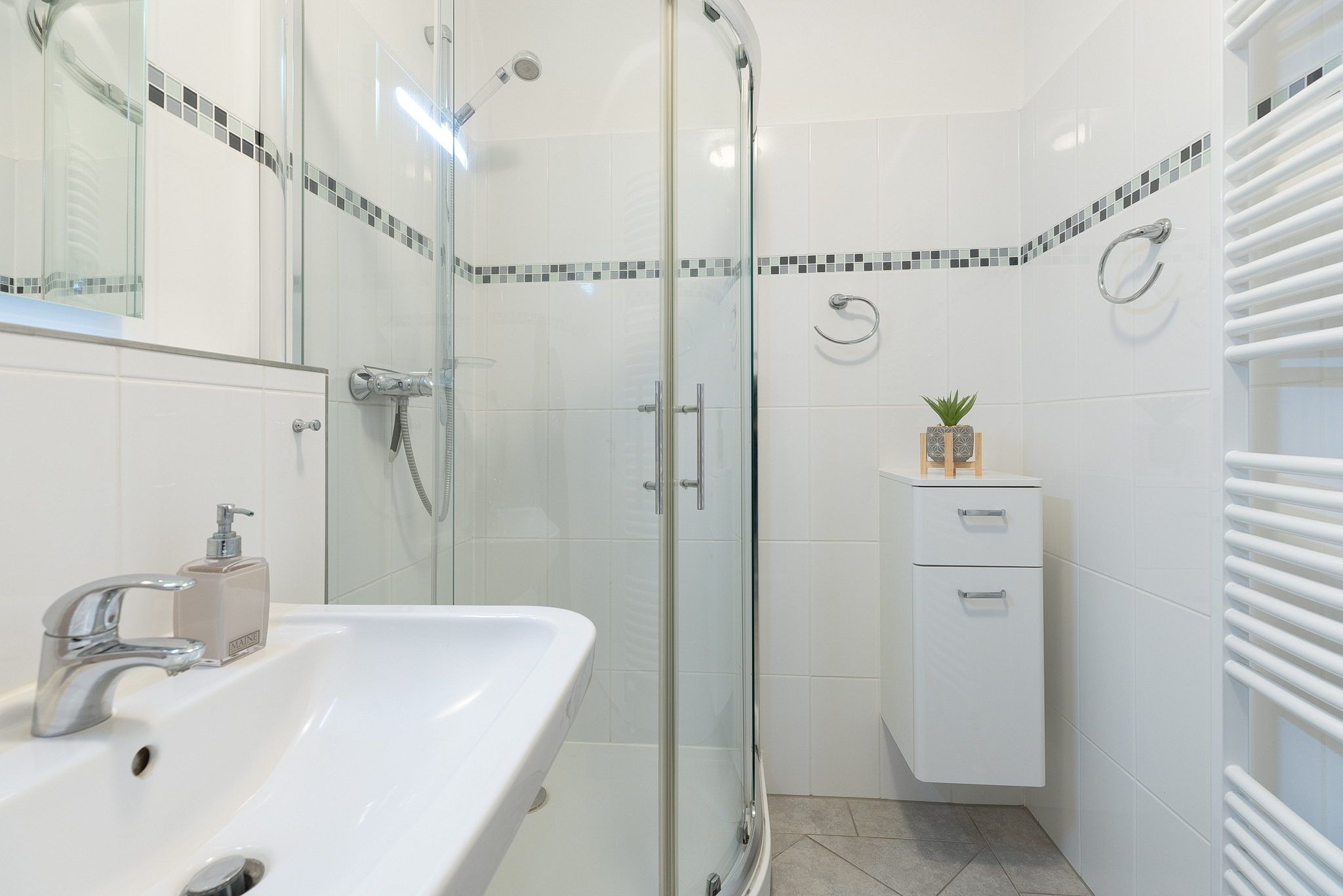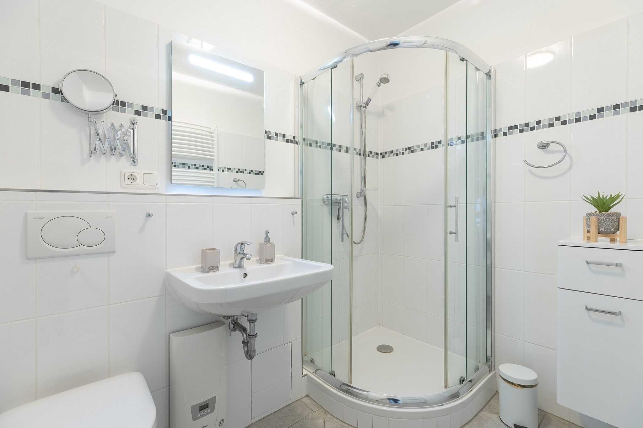 Helles modernes Bad mit Dusche, WC und Waschbecken.