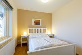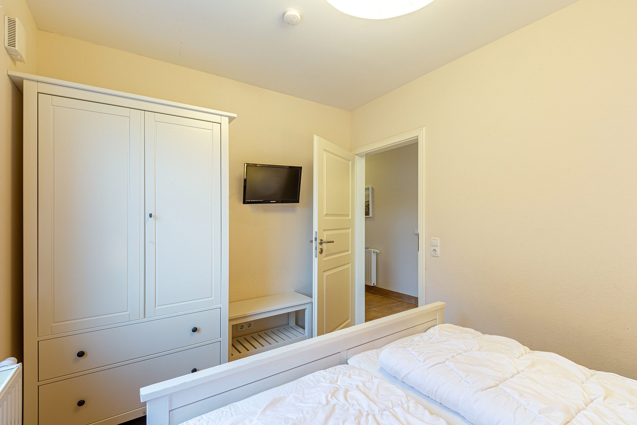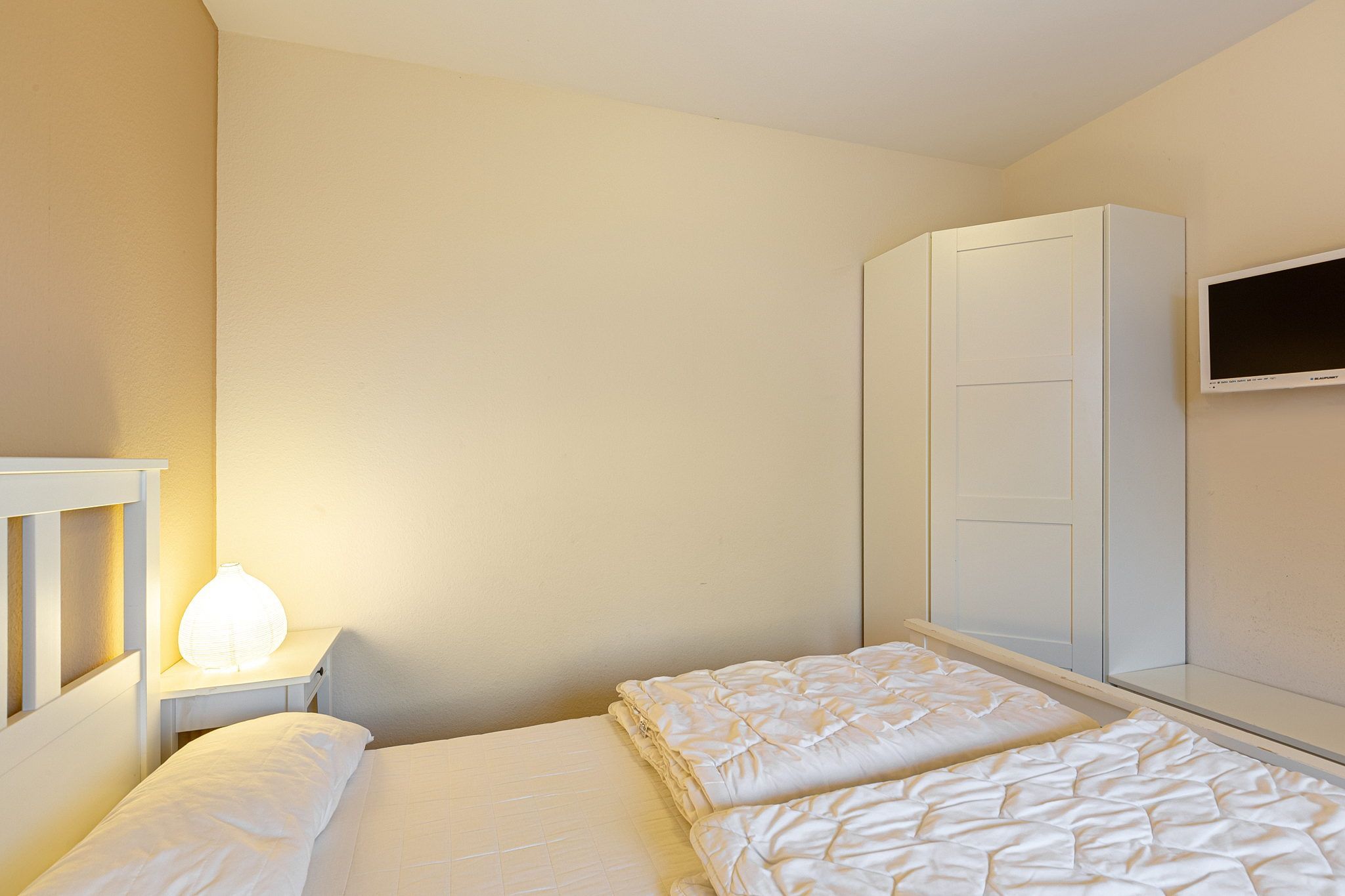 Ein weiteres Schlafzimmer im EG ist ebenfalls mit einem Doppelbett (2x 80x200cm) und einem Kleiderschrank ausgestattet. Zur Unterhaltung steht ein Flachbildschirm zur Verfügung. Das Zimmer ist gefliest, das Fenster lässt sich deutlich durch ein Innenrollo verdunkeln. Das Zimmer ist barrierefrei erreichbar