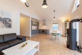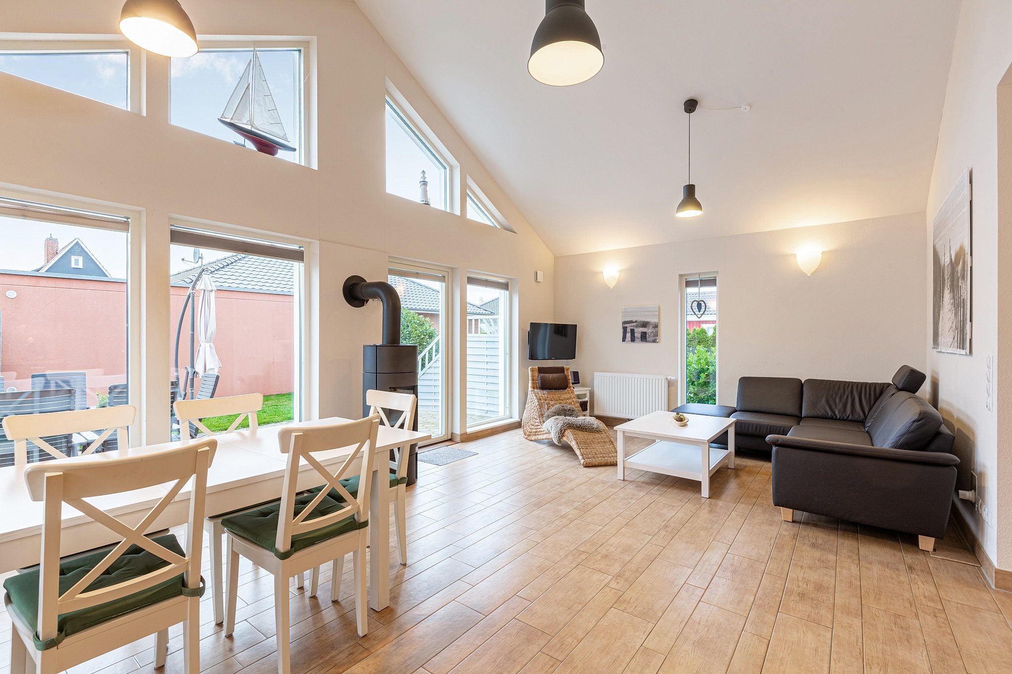 Großzügiges, lichtdurchflutetes Wohn- und Esszimmer mit direktem Zugang zur Terrasse und zum Garten. Das Wohn- und Esszimmer ist mit einem Essplatz für 6 Personen, einer Eckcouch, einem Couchtisch und einer Liege ausgestattet. Ein Schwedenofen sorgt für stimmungsvolle Wärme an kälteren Tagen. Zur Unterhaltung steht ein Flachbildschirm, ein Blue-Ray Player und eine Mini-Stereoanlage mit CD-Player und I-Pod Station zur Verfügung.