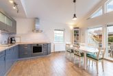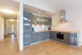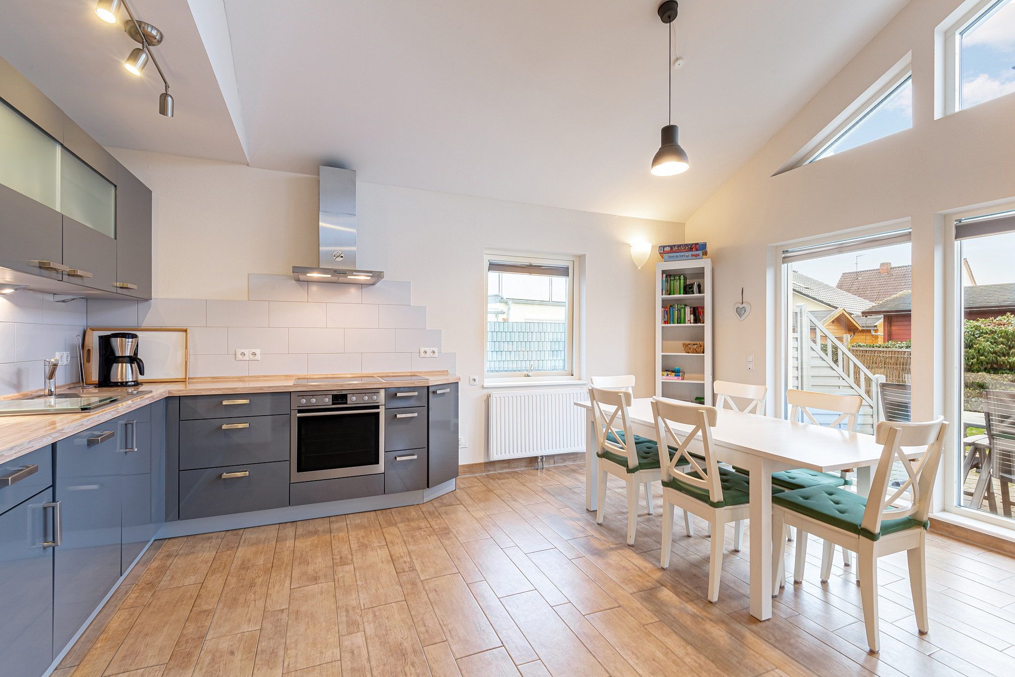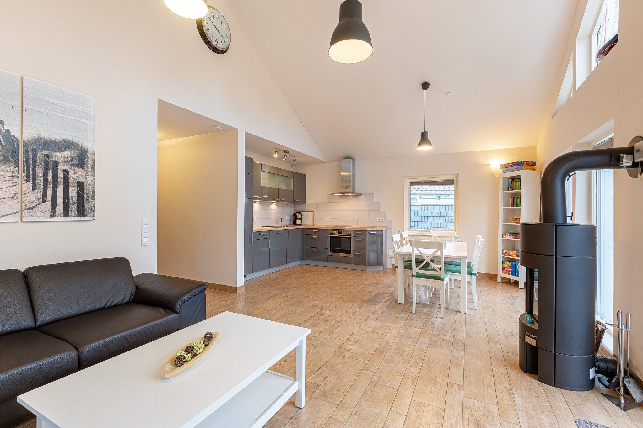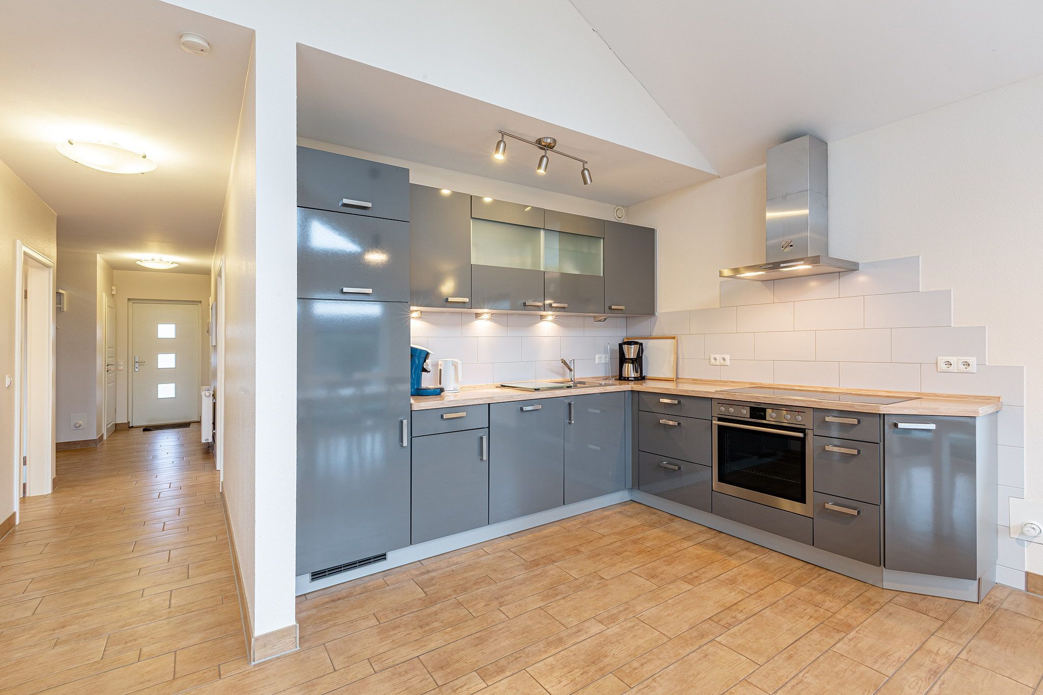 Moderne, zum Wohn- und Esszimmer offene, komplett ausgestattete Küche mit 4-Platten Cerankochfeld, Backofen, Geschirrspülmaschine, großer Kühlschrank mit kleinem 3-Sterne Gefrierfach, Kaffeemaschine, Pad-Kaffeemaschine (Senseo) Eierkocher, Toaster, Wasserkocher und Mikrowelle.