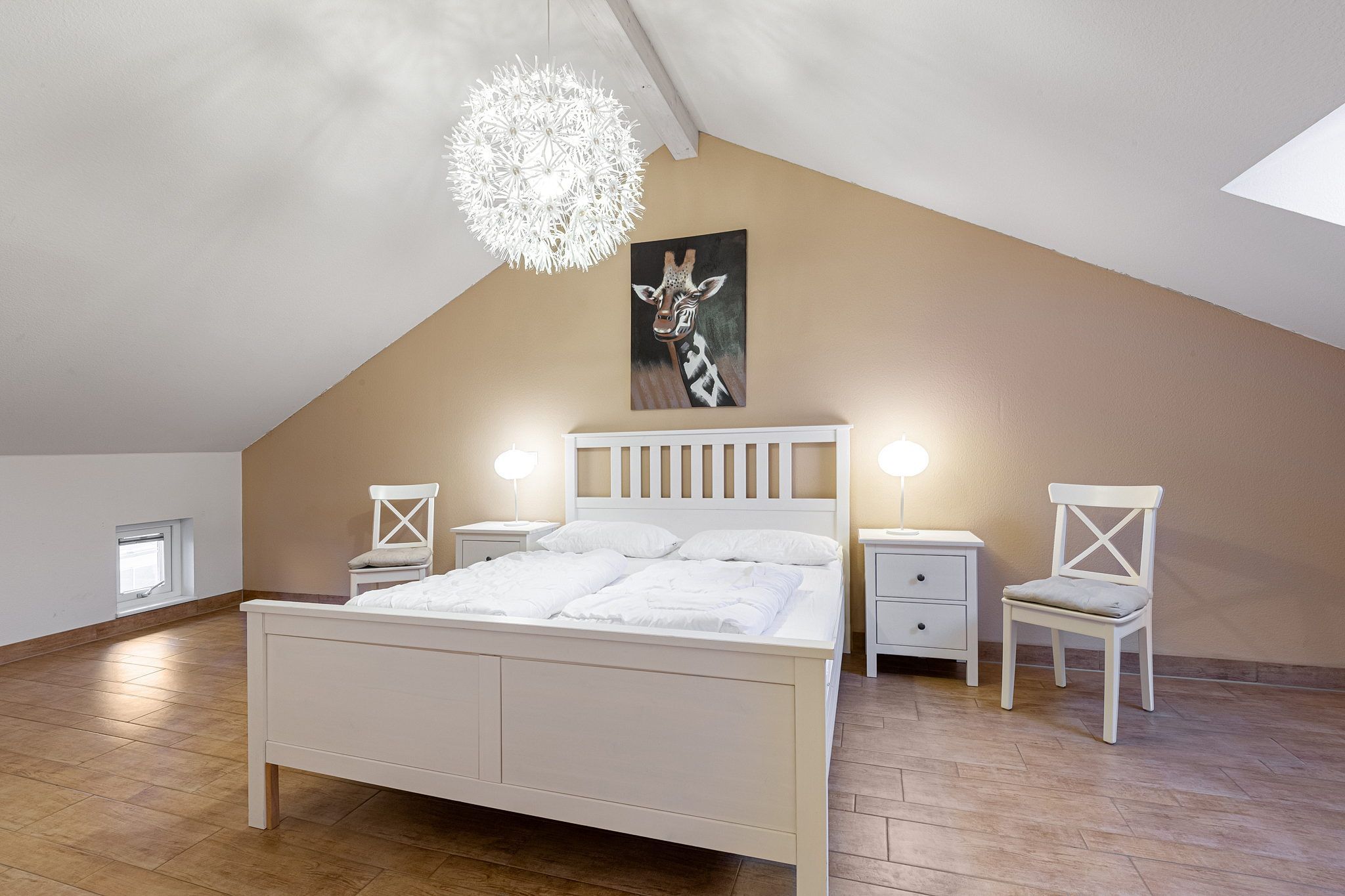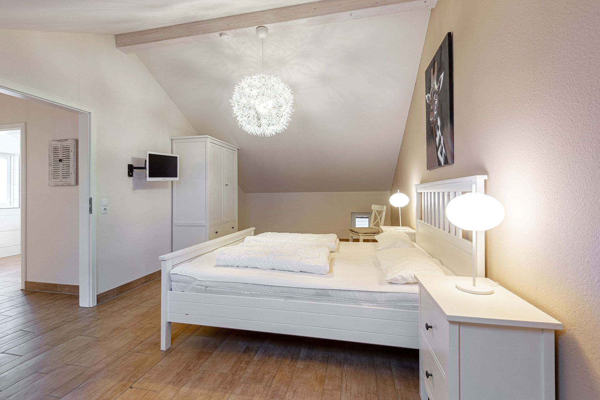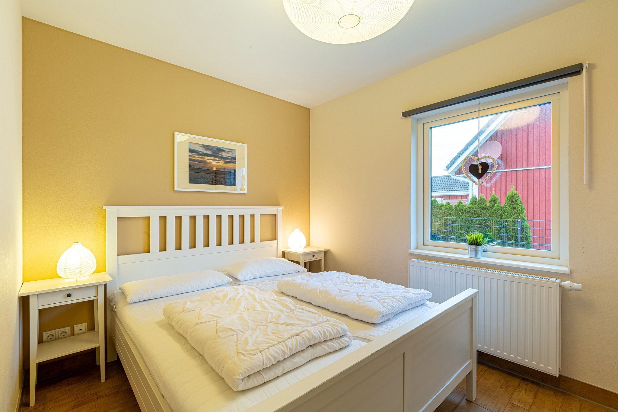 Das 2. Schlaf- bzw. Kinderzimmer im EG ist mit einem Doppelbett (140x200cm) und einem Kleiderschrank ausgestattet. Ein Flachbildschirm steht zur Unterhaltung zur Verfügung. Das Zimmer ist gefliest und barrierefrei erreichbar. Das Fenster lässt sich durch ein Innenrollo deutlich verdunkeln.