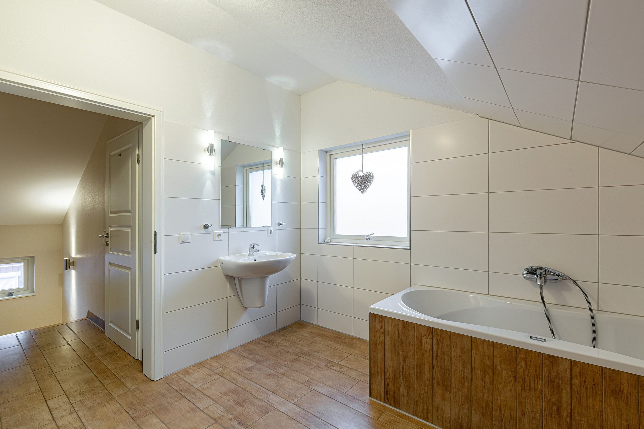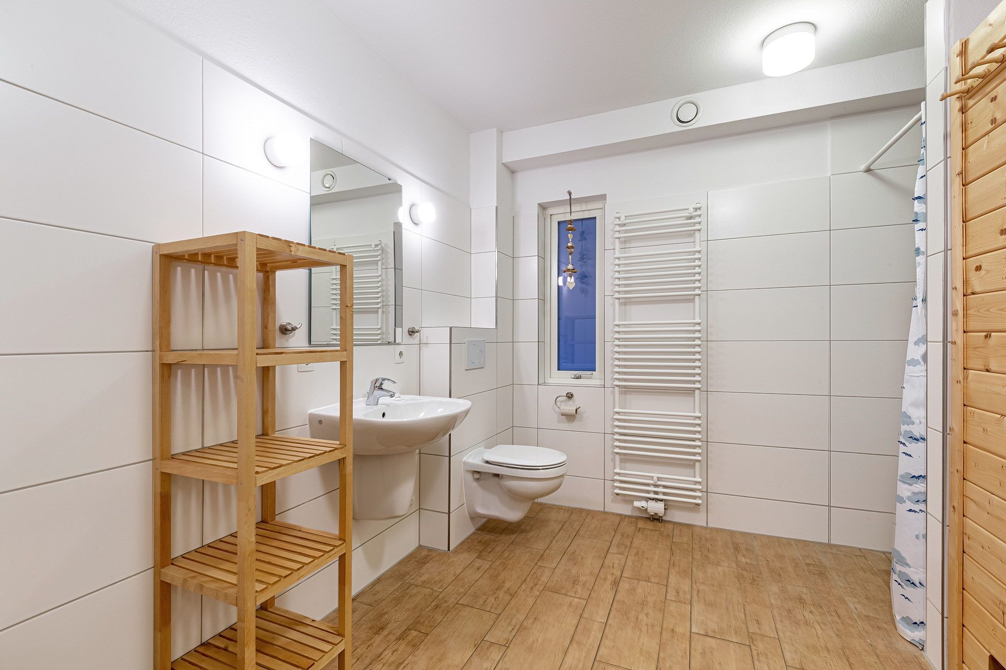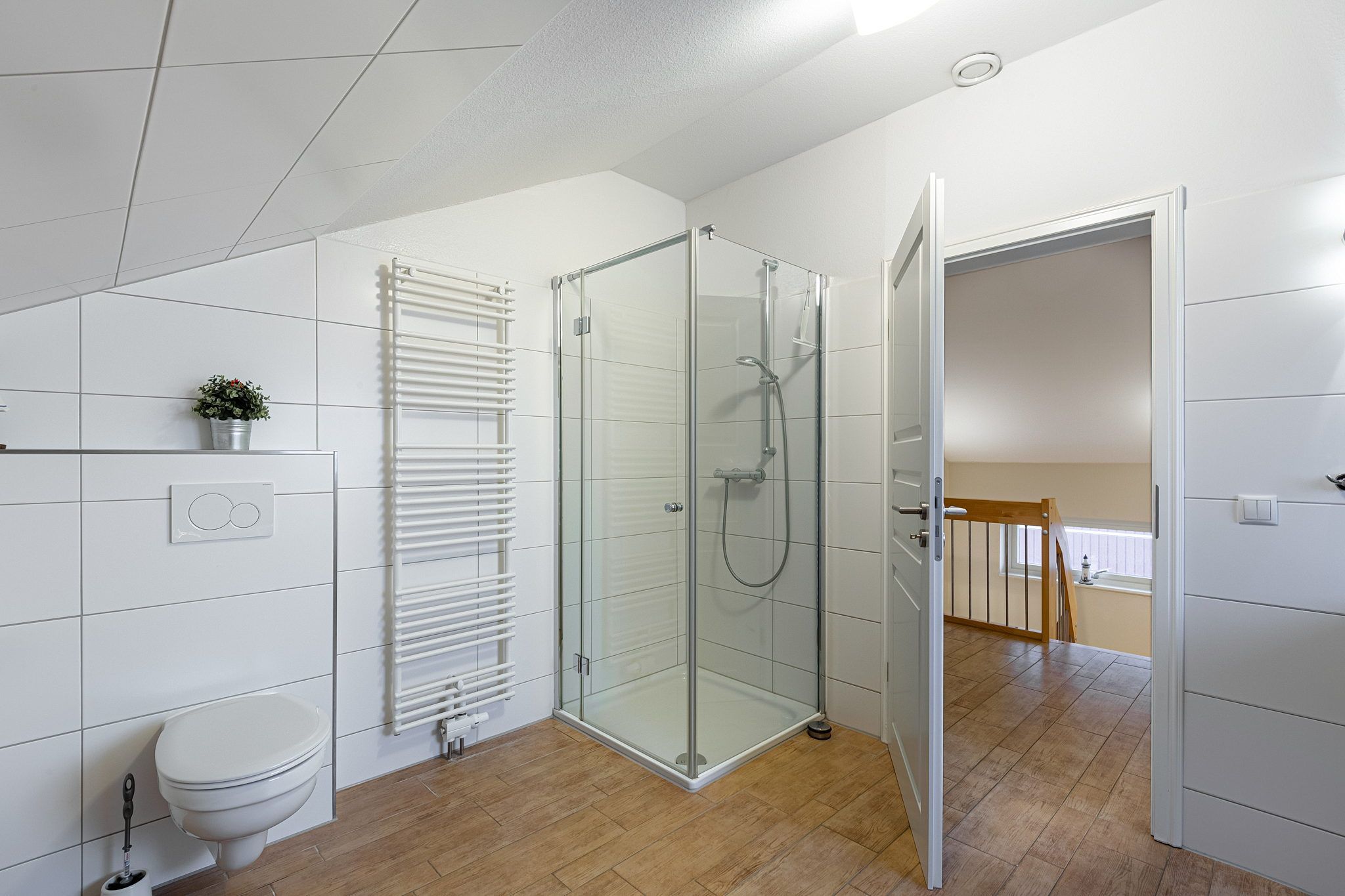 Barrierefreies, modernes Tageslichtbad im EG und ein weiteres modernes Tageslichtbad im 1. OG jeweils mit Dusche, WC und Waschbecken, sowie einer Sauna im EG und einer Whirlpool-Badewanne im 1.OG.