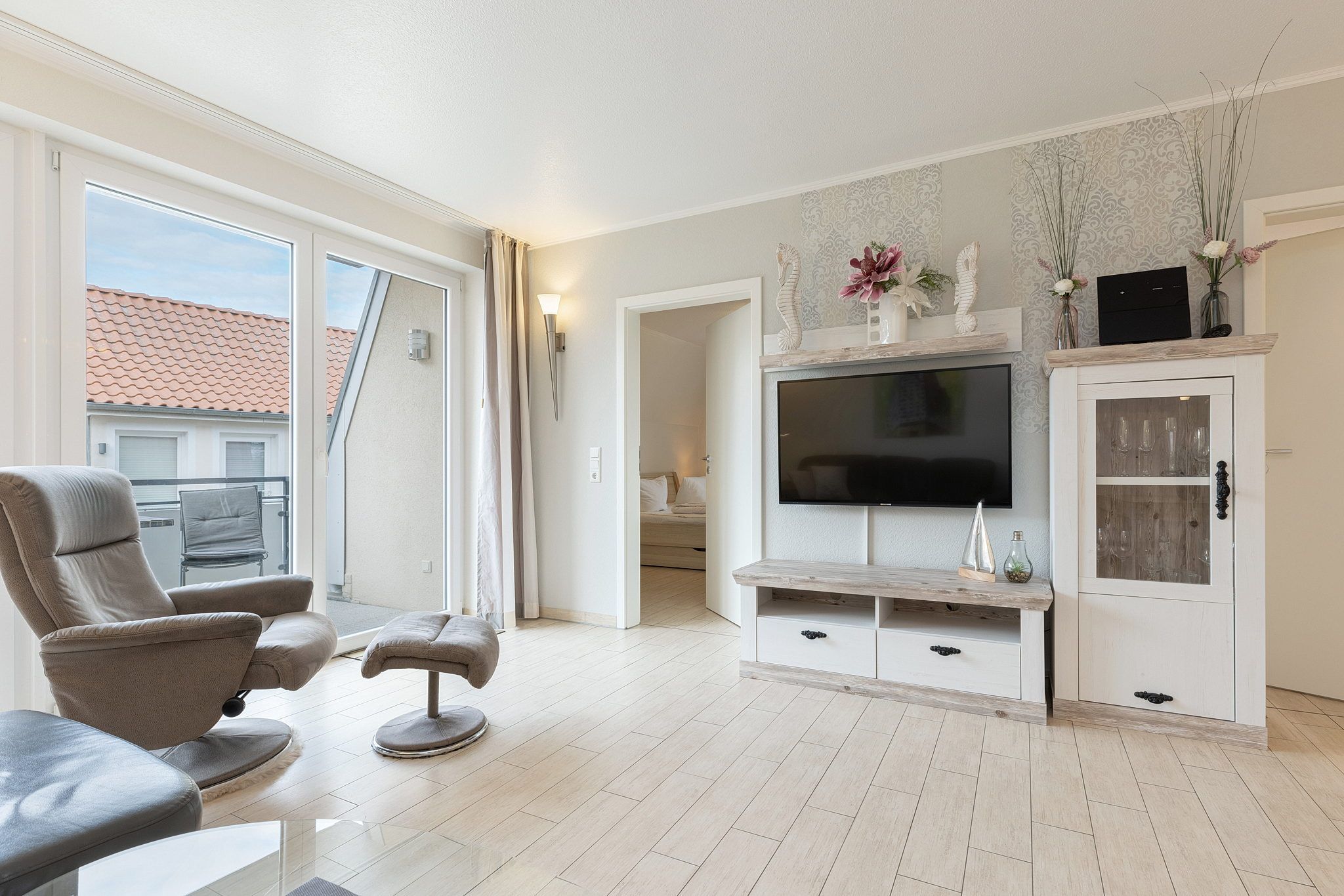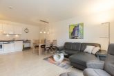 Modern ausgestattetes Wohn- und Esszimmer mit direktem Zugang zum Balkon. Das Wohn- und Esszimmer ist mit einem Essplatz für 4 Personen, einer Ledercouch, einem Couchtisch, einem TV-Sessel, einer Wohnzimmerkommode und einem Vitrinenschrank ausgestattet. Zur Unterhaltung stehen ein Flachbildschirm und eine Mini-Stereoanlage zur Verfügung. Das Zimmer ist mit Designer-Planken ausgelegt.