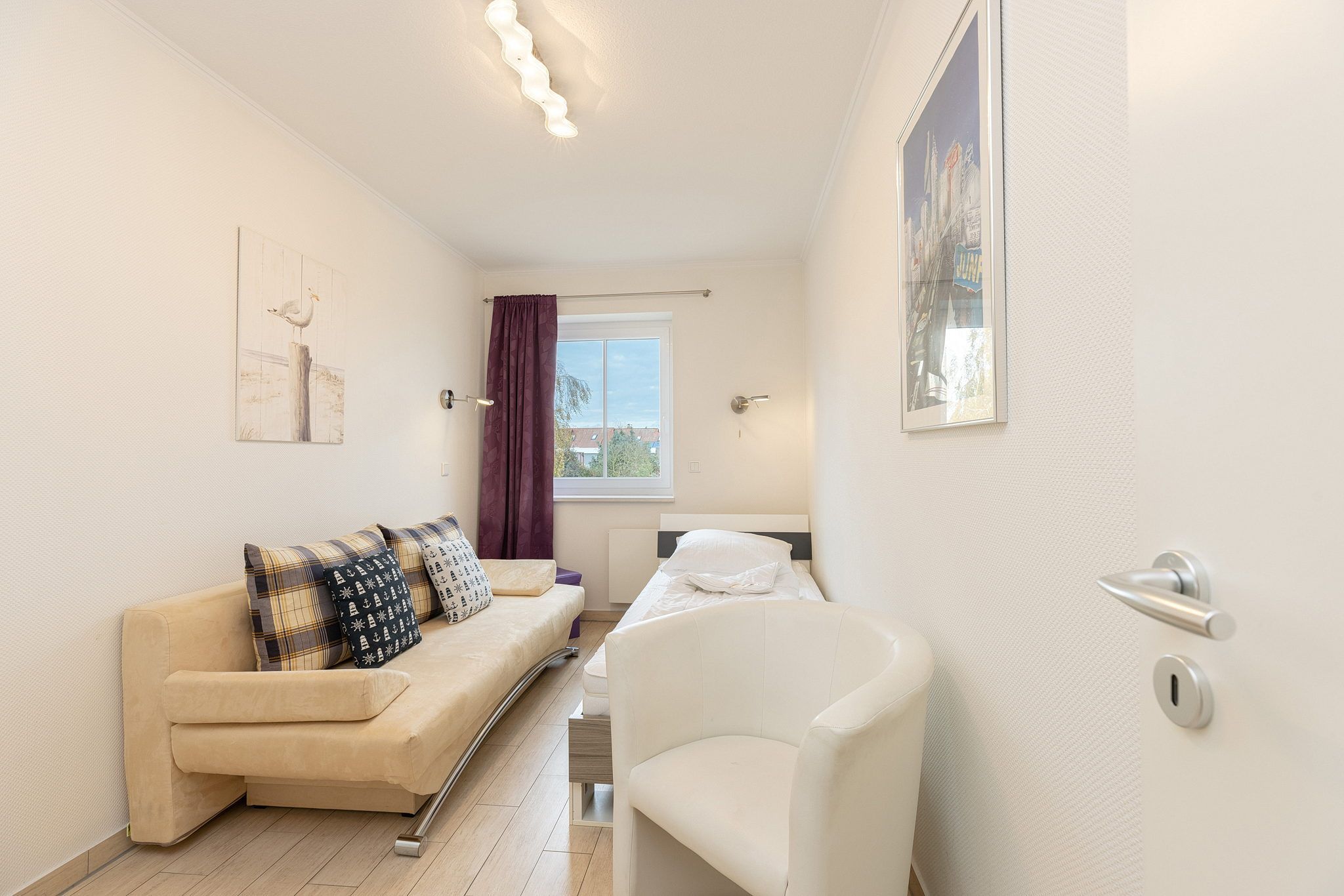 Das 2. Schlafzimmer ist ausgestattet mit einem Einzelbett (90x200cm) und einer Schlaf-Liege (75x190cm). Zur Unterhaltung steht auch hier ein Fernseher bereit. Der Raum ist mit Designer Planken ausgelegt, das Fenster lässt sich durch einen Vorhang verdunkeln.