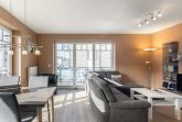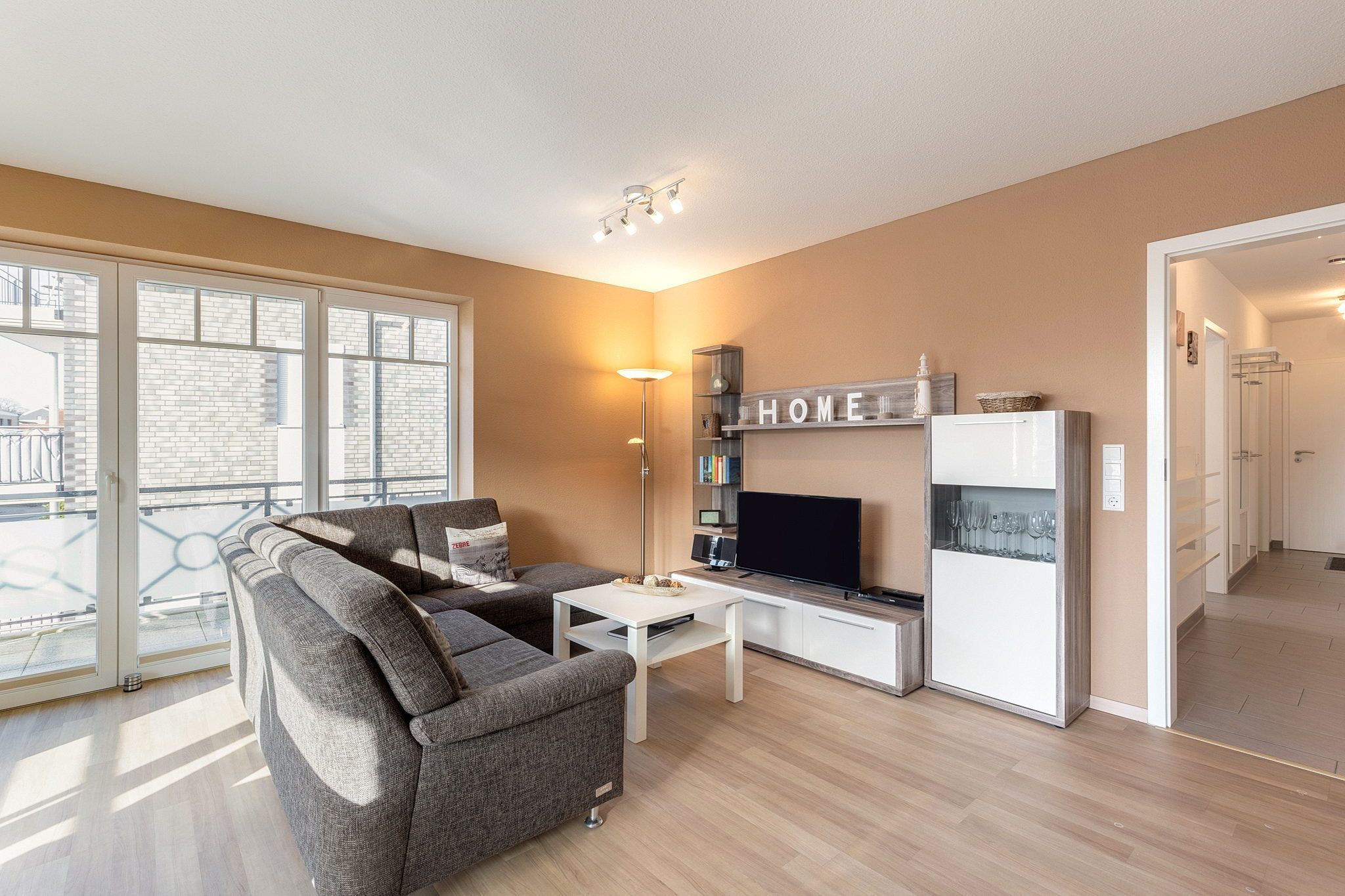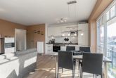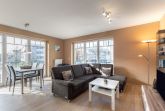 Modernes, helles Wohn- und Esszimmer mit direktem Zugang zum Balkon in westliche Richtung. Das Wohn- und Esszimmer ist mit einem Essplatz für 4 Personen, einer Eckcouch und einem Couchtisch ausgestattet. Zur Unterhaltung stehen ein Flachbildschirm, ein DVD-Player und eine Mini-Stereoanlage zur Verfügung.