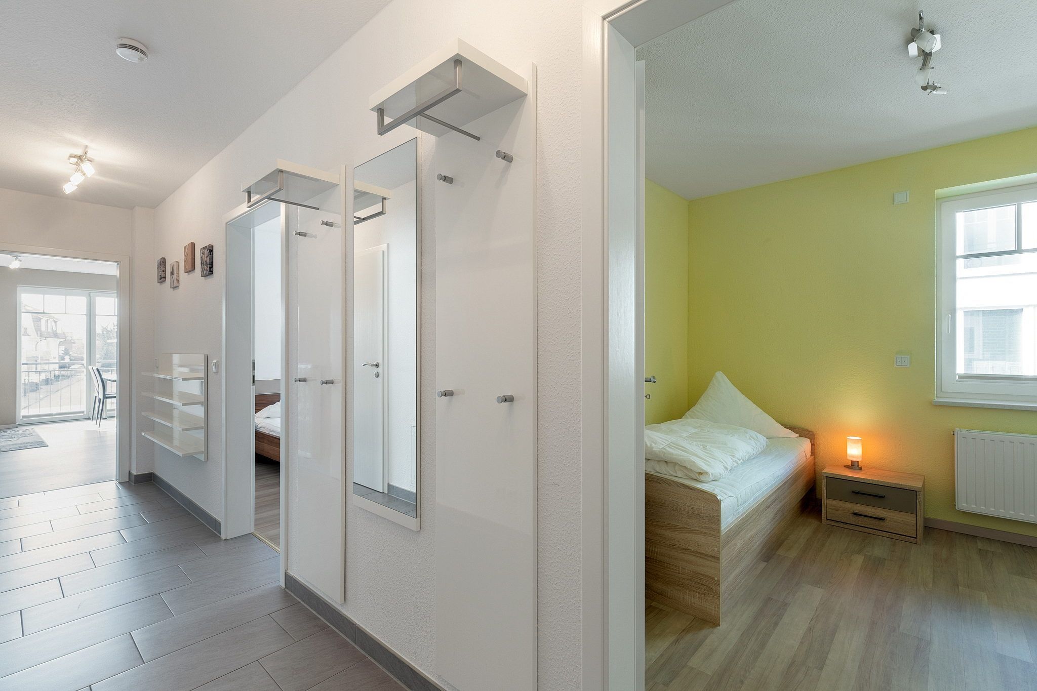 Separates, modern ausgestattetes Schlafzimmer mit einem Doppelbett (2x 90x200cm) und einem Kleiderschrank. Zur Unterhaltung steht ein Flachbildschirm zur Verfügung. Das Fenster lässt sich durch einen Außenrollladen vollständig verdunkeln.