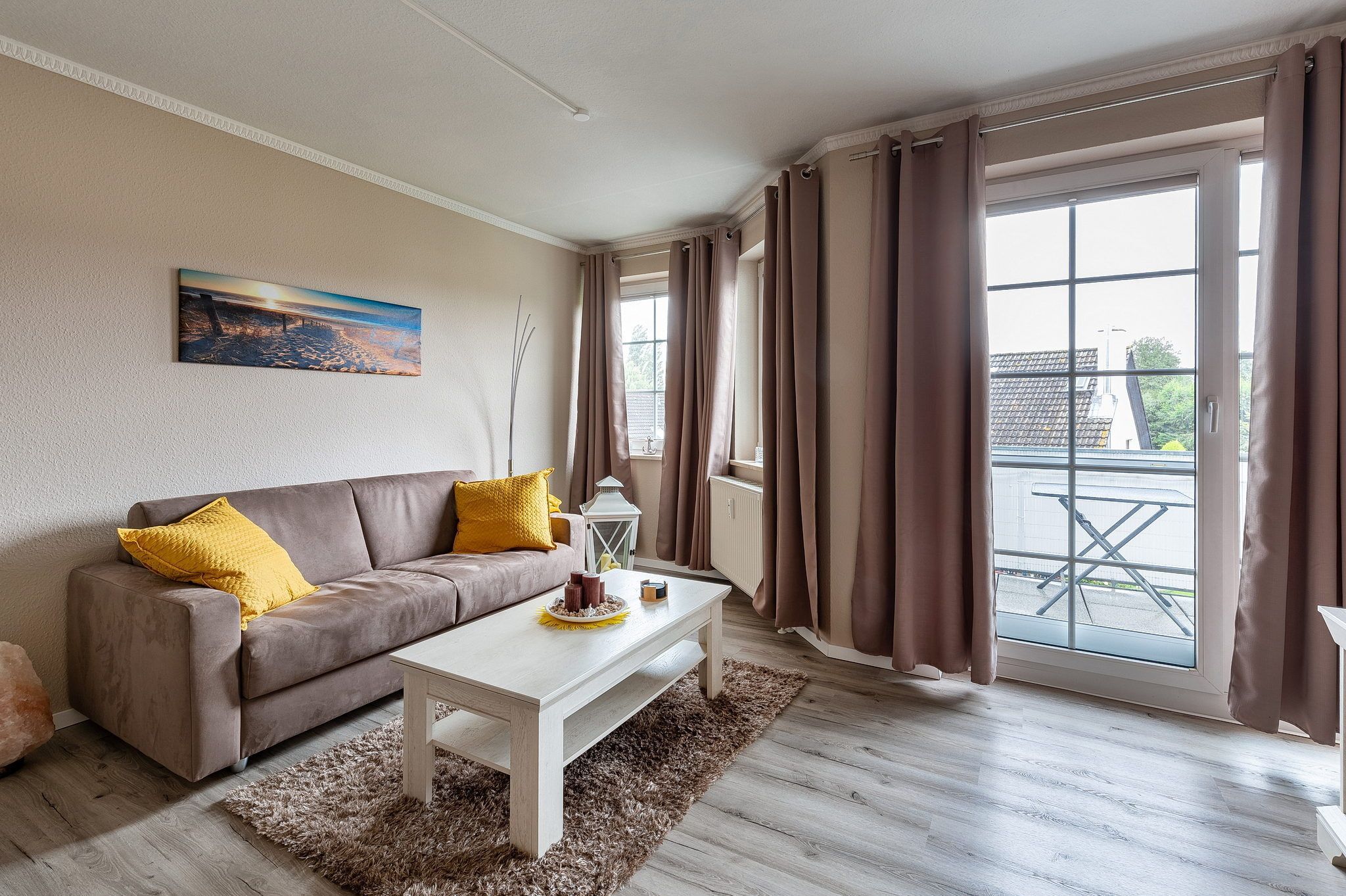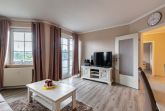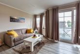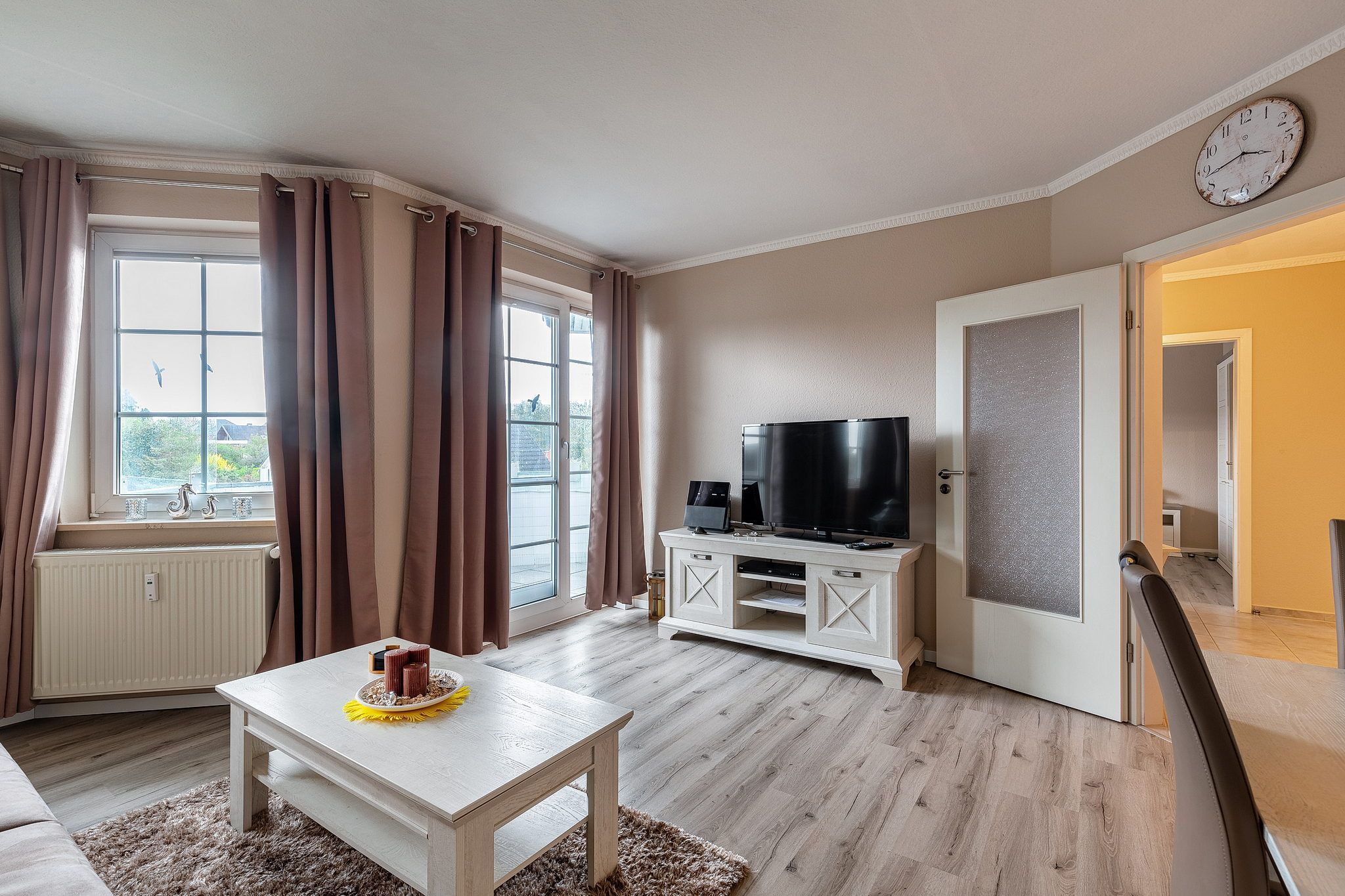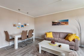 Lichtdurchfluteter freundlicher Wohn-Essbereich mit direktem Zugang zum Balkon. Das Wohnzimmer ist mit einer gemütlichen Schlafcouch ausgestattet, diese lässt sich mit wenigen Handgriffen zu einer vollwertigen Schlafmöglichkeit ausklappen. Die Liegefläche hat 140x200cm und verfügt über einen Lattenrost sowie eine vollwertige Matratze. Der Esstisch bietet Platz für 4 Personen. Zur Unterhaltung stehen ein Flachbildfernseher, ein Blu-ray-Player (mit Kinderfilmen) eine Stereo-Anlage sowie Gesellschaftsspiele zur Verfügung. Der Raum lässt sich durch Plissee und Vorhänge verdunkeln. Der Boden ist mit Laminat ausgelegt.