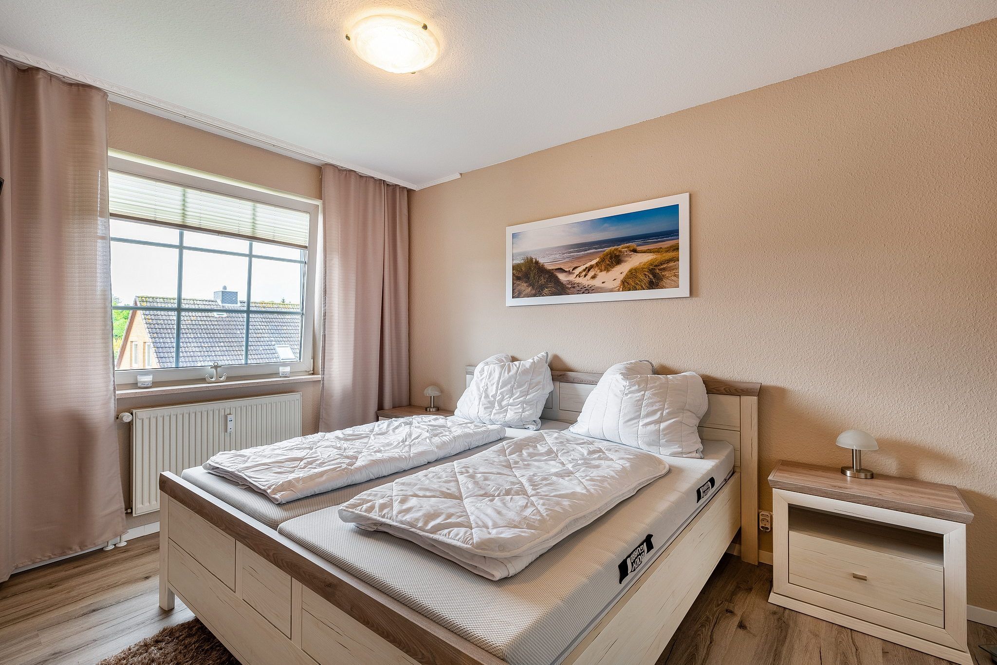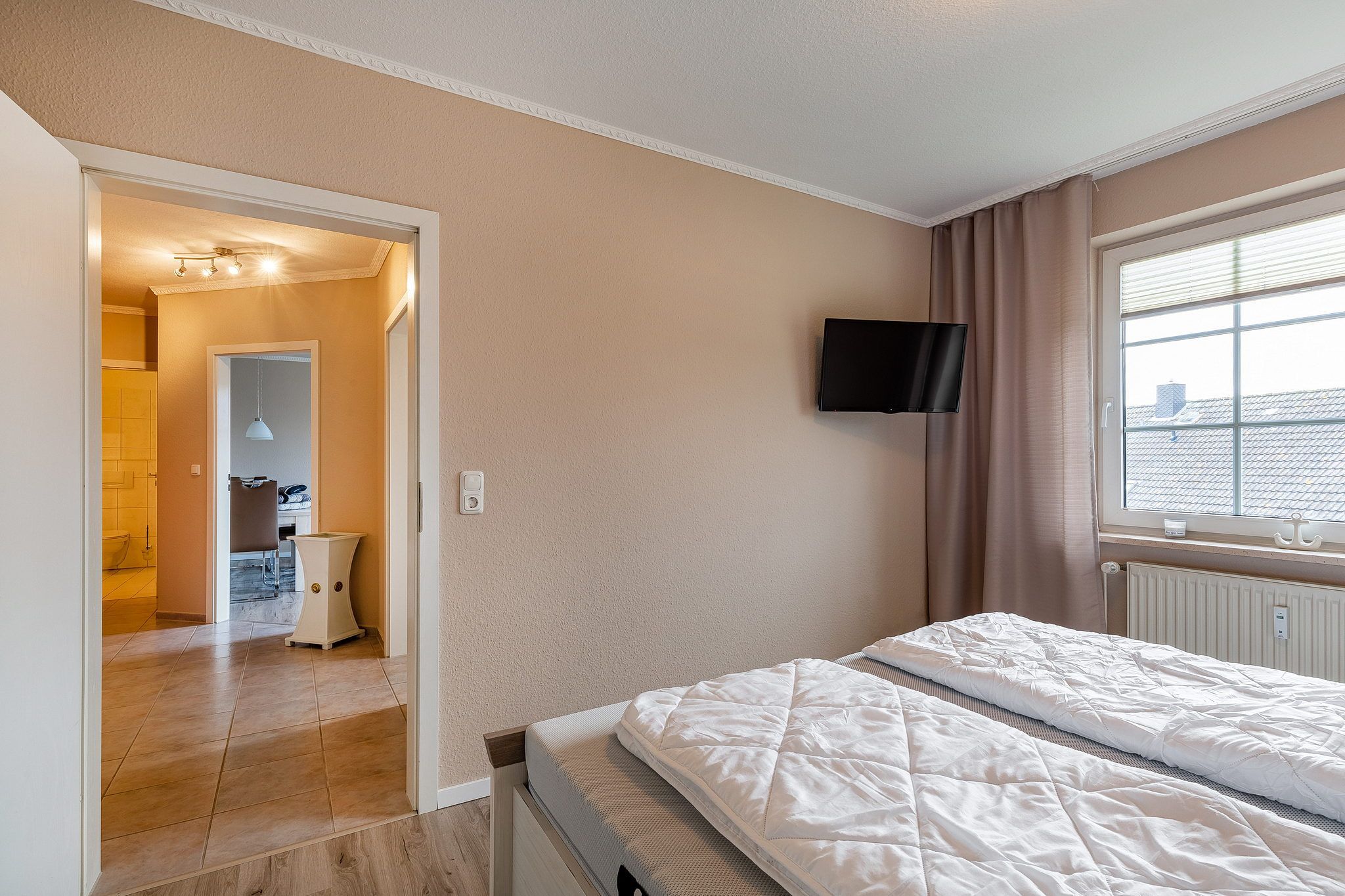 Modernes Schlafzimmer mit einem Doppelbett (2x90x200cm) einem 3-türigen Kleiderschrank und zusätzlichem Flachbildfernseher. Die Fenster lassen sich durch ein Plissee und Vorhänge verdunkeln, der Boden ist mit Laminat ausgelegt.