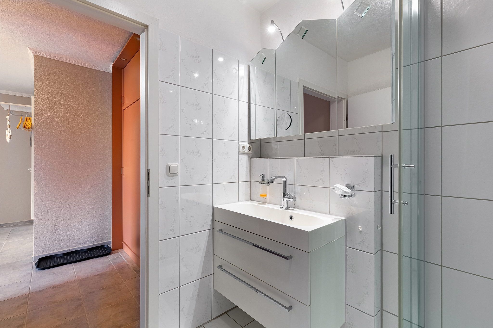 Hell gefliestes Badezimmer mit Dusche, WC und Waschbecken.