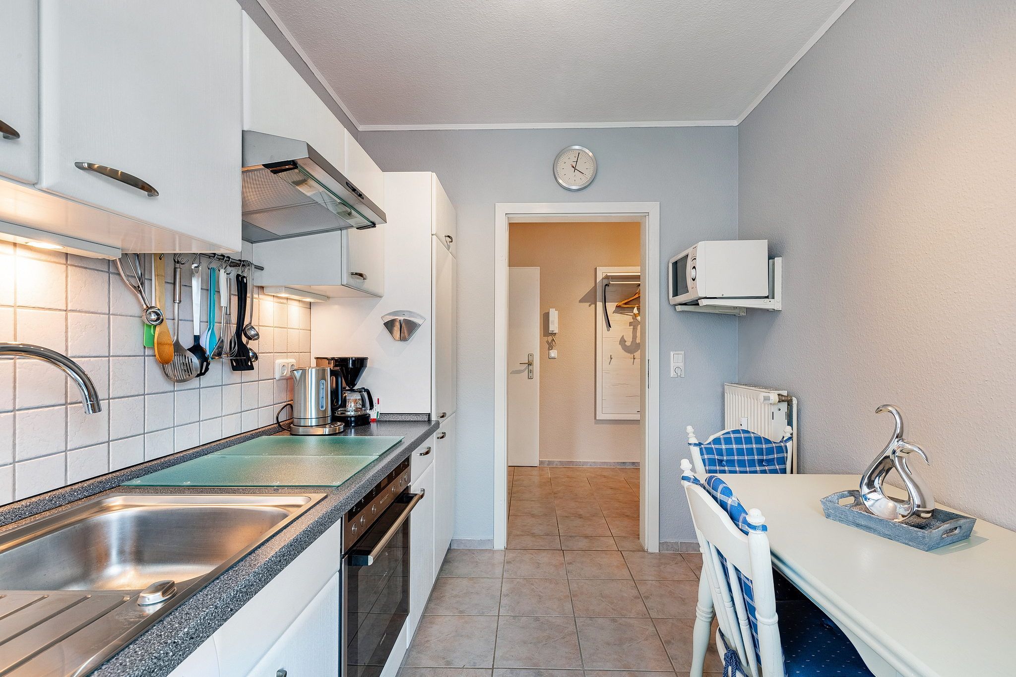Separate Küche mit 4 Platten-Cerankochfeld, Kühlschrank mit Gefrierfach, Spülmaschine, Backofen und Mikrowelle. Ein Wasserkocher, Kaffeemaschine und Toaster gehören ebenfalls zur Ausstattung.