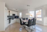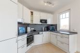 Komplett ausgestattete, zum Wohn- und Esszimmer offene Küche mit 4 Platten Cerankochfeld, Backofen, Spülmaschine, Kühlschrank mit kleinem Gefrierschrank, Mikrowelle, Kaffeemaschine, Wasserkocher, Toaster und Eierkocher.