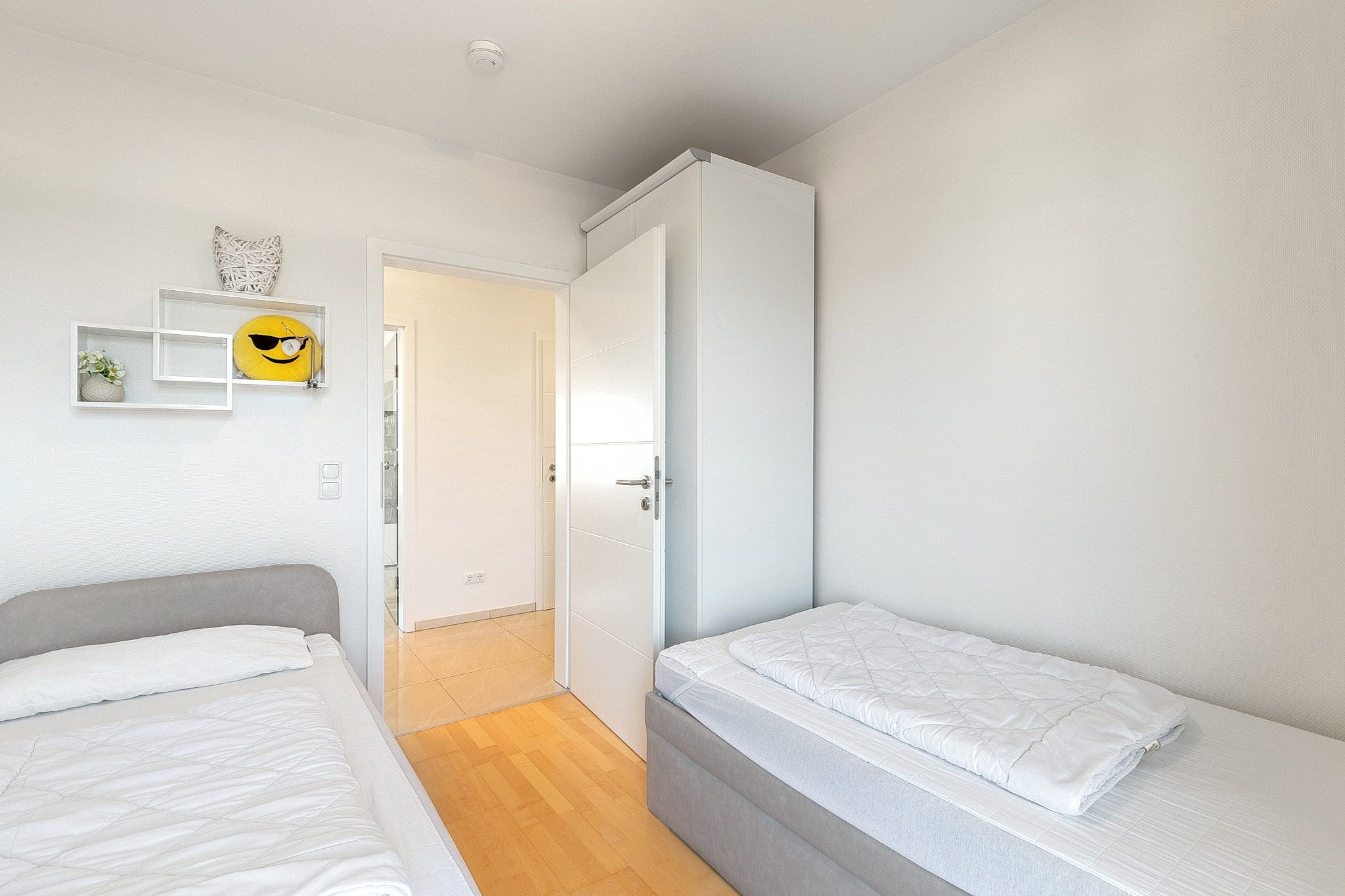 Das separate, modern ausgestattete 2. Schlafzimmer ist mit 2 Einzelbetten (90x200cm) und einem Kleiderschrank ausgestattet. Vom Zimmer direkter Zugang zum Balkon in nord-westliche Richtung. Die Fenster lassen sich durch elektrische Außenrollos vollständig verdunkeln. Das Zimmer ist mit Echtholzparkett ausgelegt.