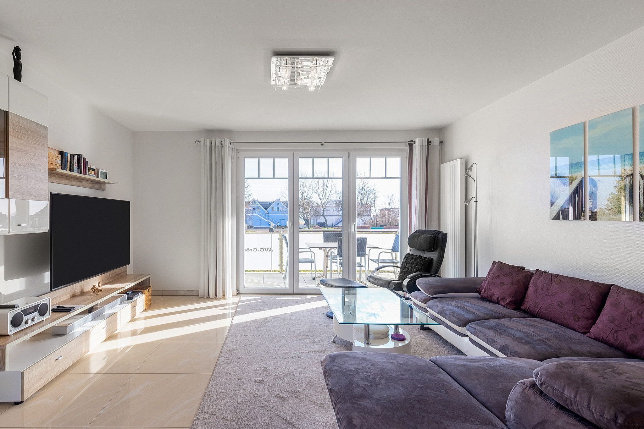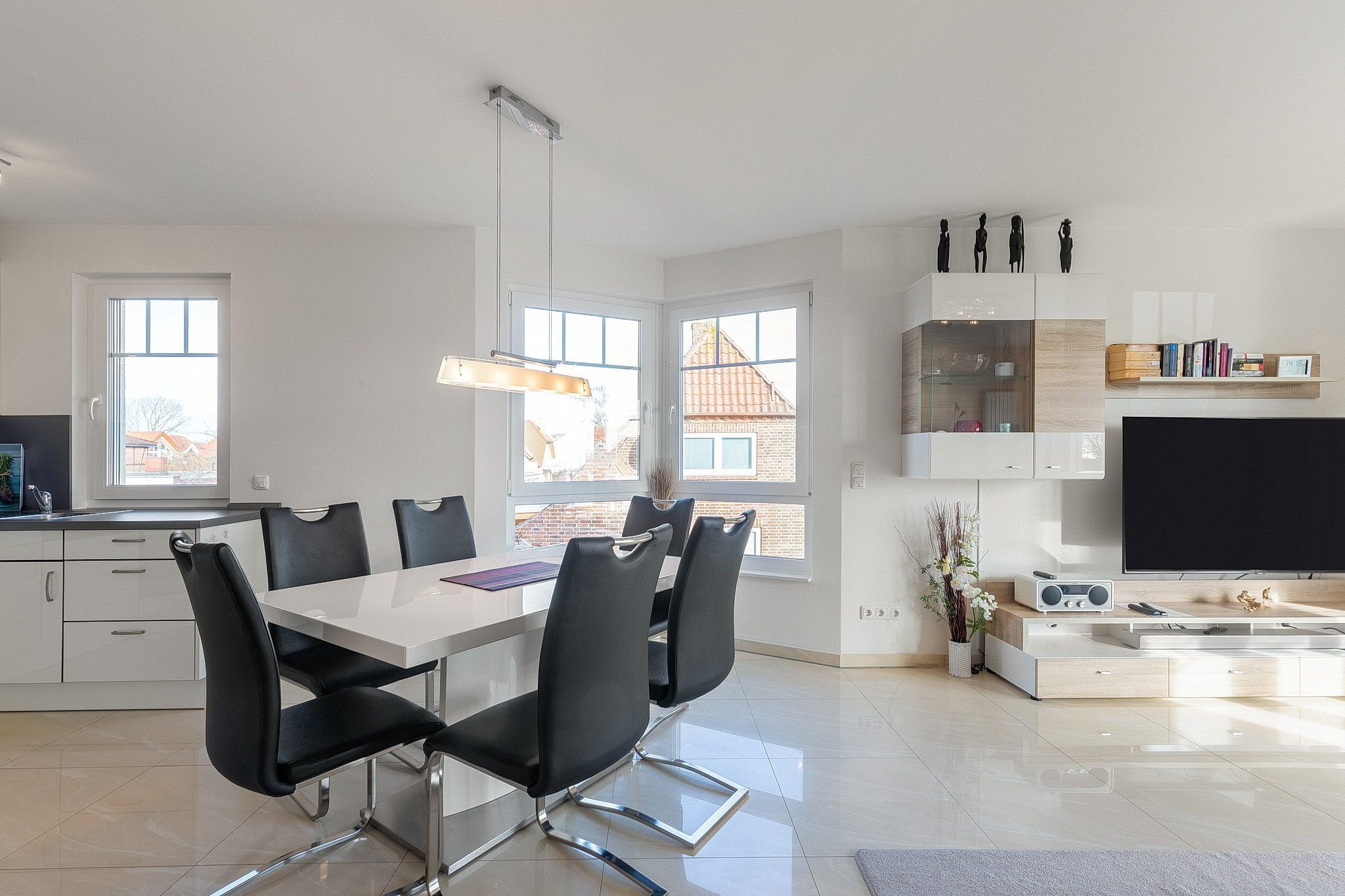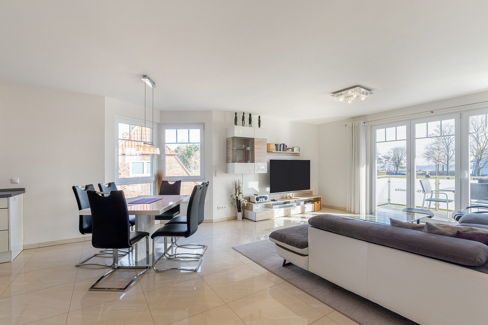 Das modern ausgestattete Wohn- und Esszimmer ist mit einem großzügigen Essplatz, einem Komfort-Ecksofa, einem Couchtisch, einer Wohnwand und einer Vitrine ausgestattet. Vom Wohnbereich direkter Zugang zum Balkon mit Blick auf den Deich, Promenade und aufs Meer. Das Zimmer ist mit Designer-Fliesen ausgelegt (Fußbodenheizung); die Fenster lassen sich durch elektrische Außenrollos vollständig verdunkeln. Zur Unterhaltung stehen ein Flachbildschirm mit Blue-Ray- und CD-Player sowie eine Mini-Stereoanlage mit Bluetooth und CD-Player zur Verfügung.