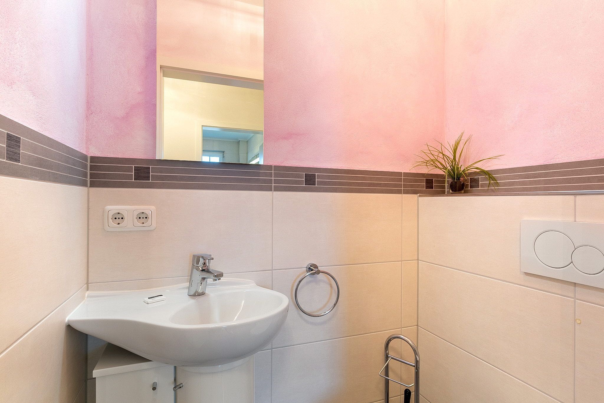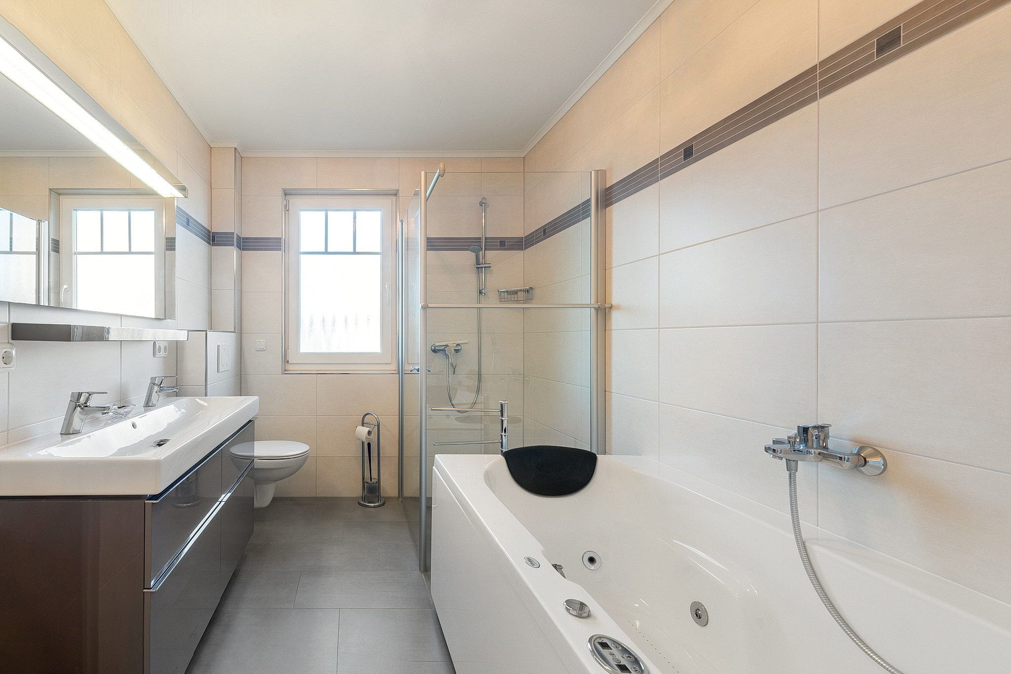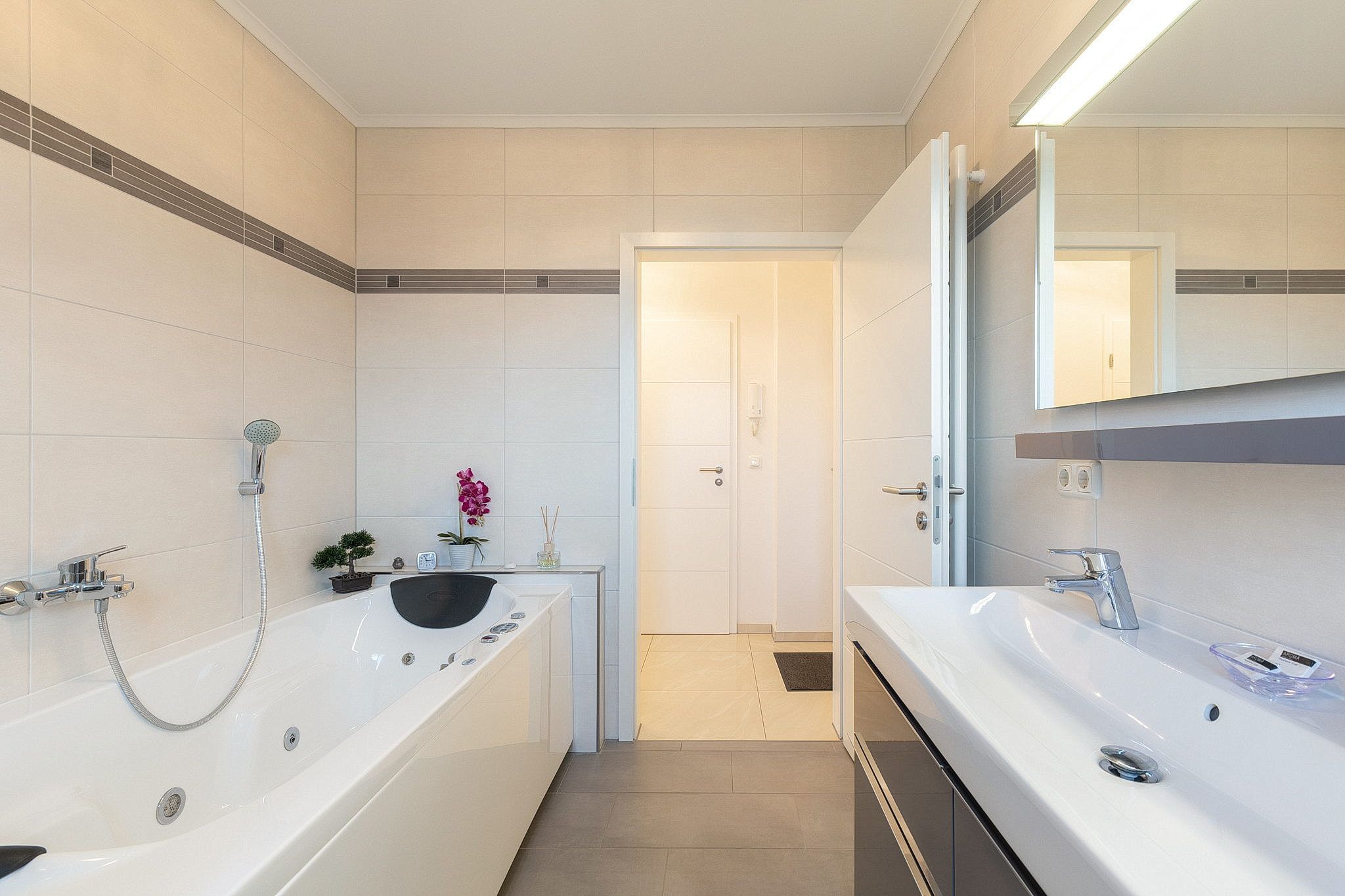 Modernes, gefliestes Tageslichtbad mit ebenerdiger Dusche, Badewanne, Doppelwaschtisch und Toilette. Zusätzlich gibt es ein separates Gäste-WC.