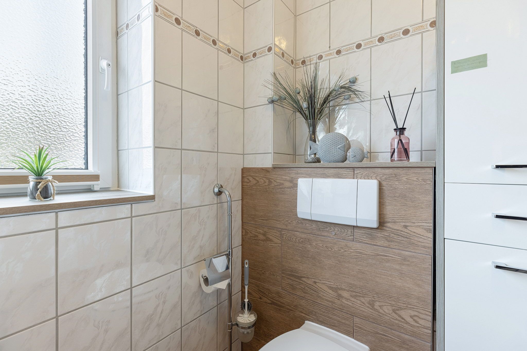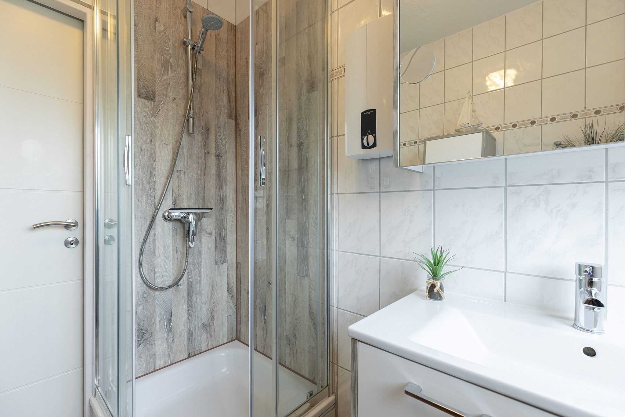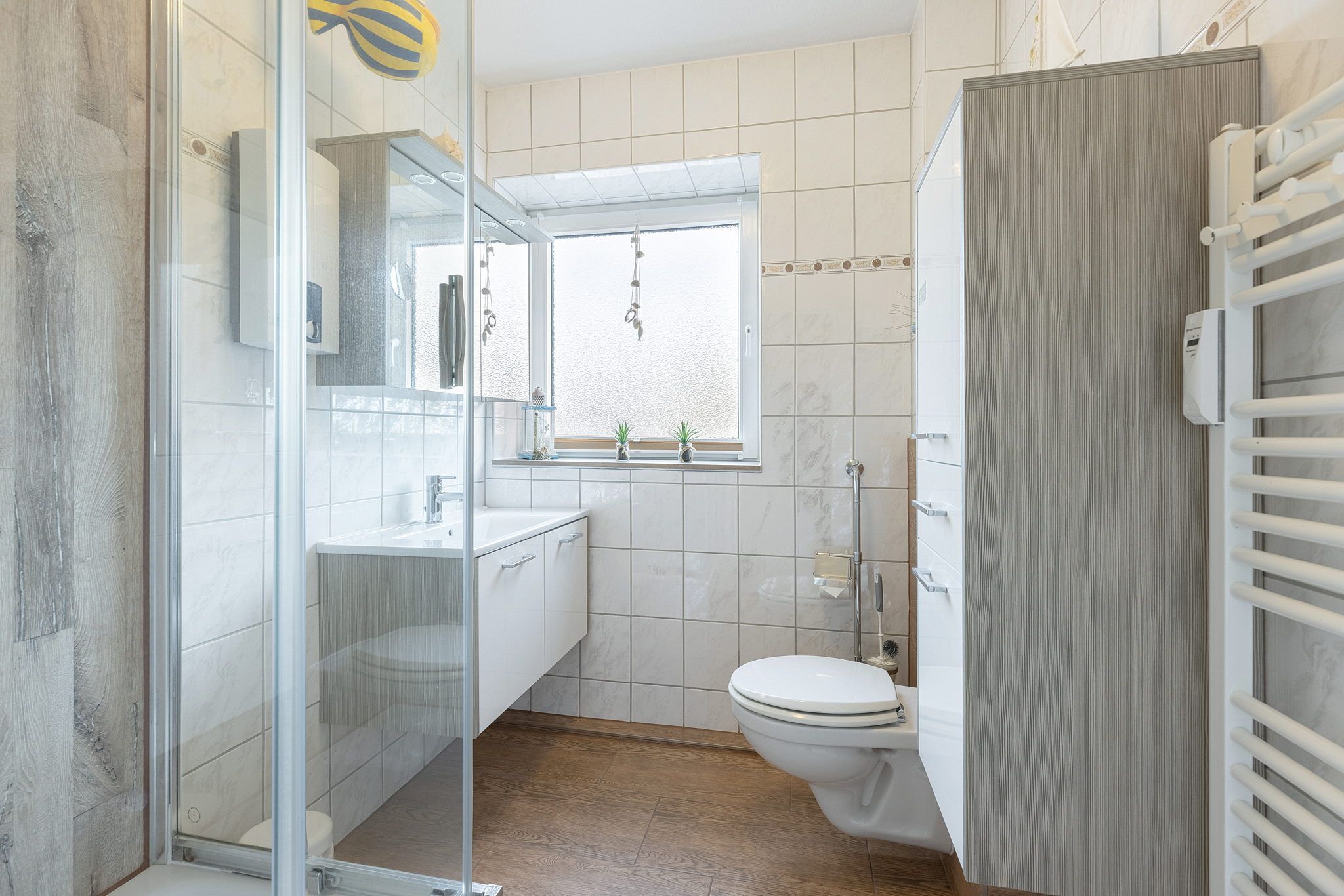 Hell gefliestes Bad mit Dusche, WC und Waschbecken.