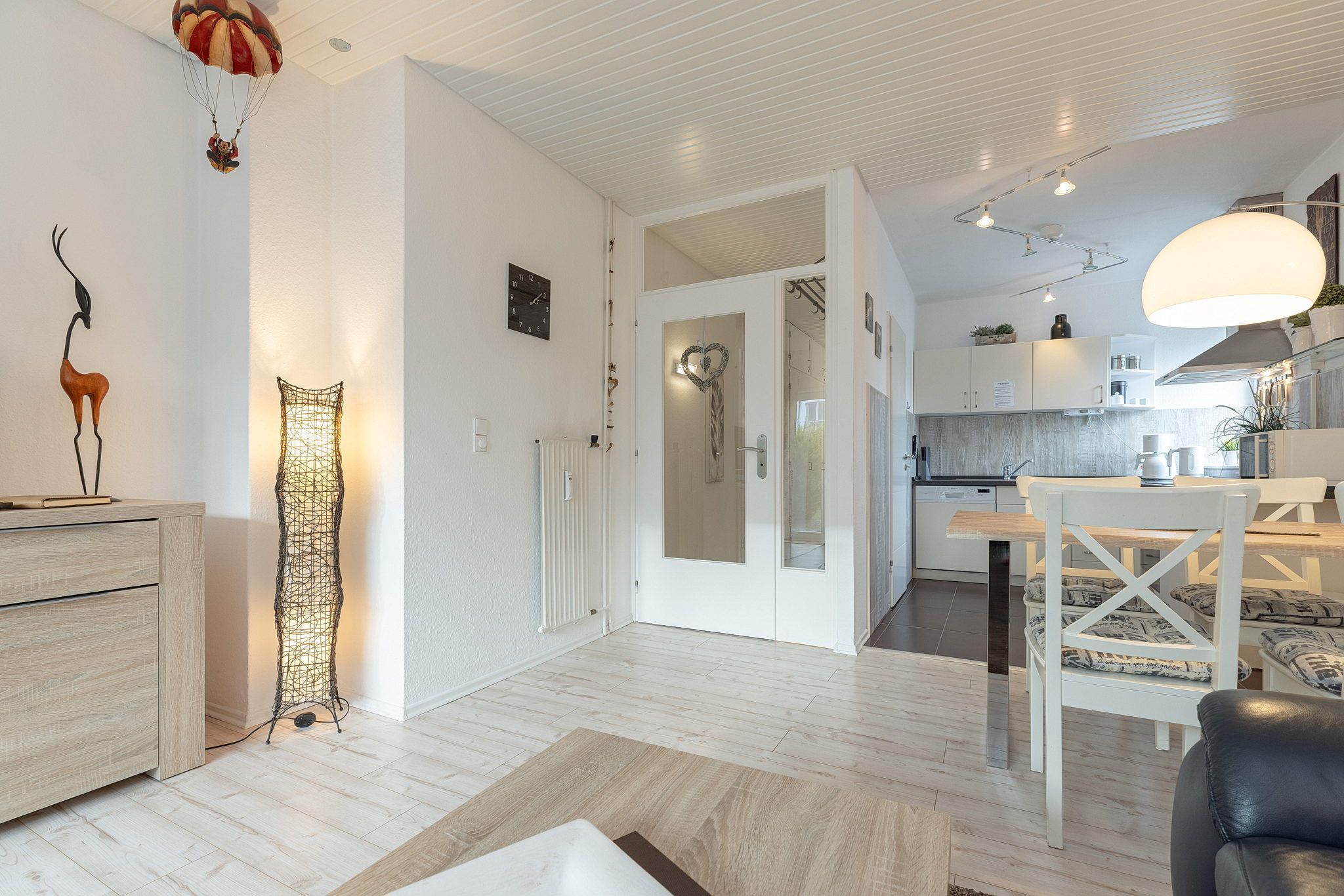 Moderne hochwertige zum Wohnbereich offene komplett ausgestattete Küche mit Kühlschrank, Spülmaschine, Mikrowelle, Backofen und 4-Platten-Cerankochfeld. Außerdem stehen eine Kaffeemaschine, ein Wasserkocher und ein Toaster zur Nutzung bereit.