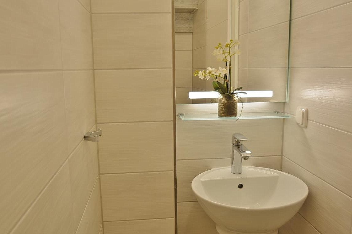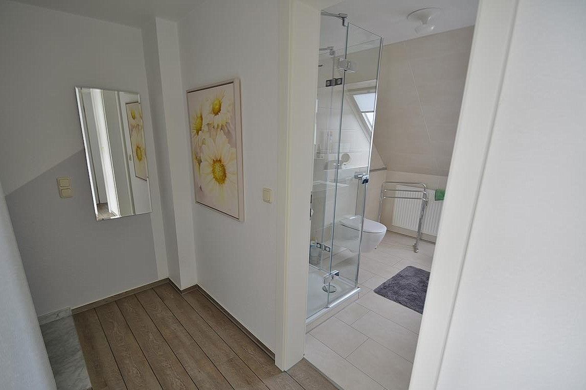 Modernes, hell gefliestes Tageslichtbad im 2.OG. Das Bad verfügt über eine Dusche, Waschbecken und WC. Ein weiteres modernes WC befindet sich im 1. OG.