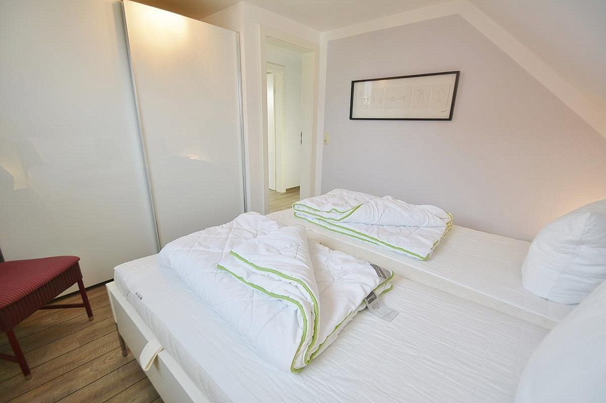 Das separate, modern ausgestattete Schlafzimmer im 1. OG verfügt über 2 Einzelbetten (je 90x200cm) und einem 2-türigen Kleiderschrank. Das Zimmer ist mit Designer-Planken ausgestattet. Das Fenster lässt sich durch ein Plissee vollständig verdunkeln.