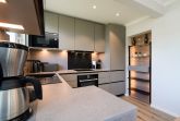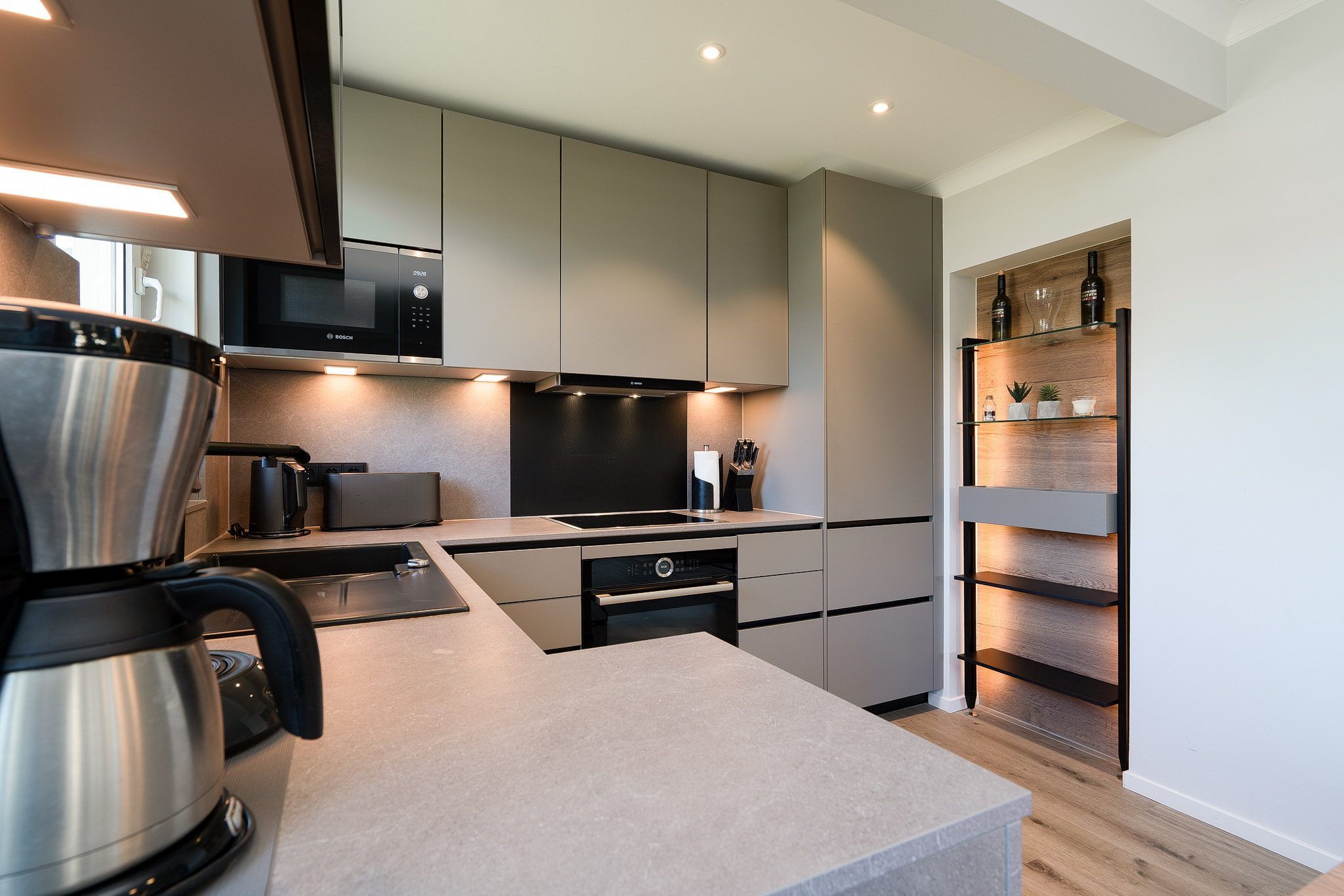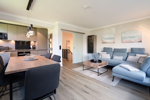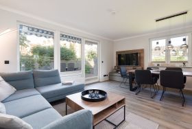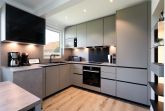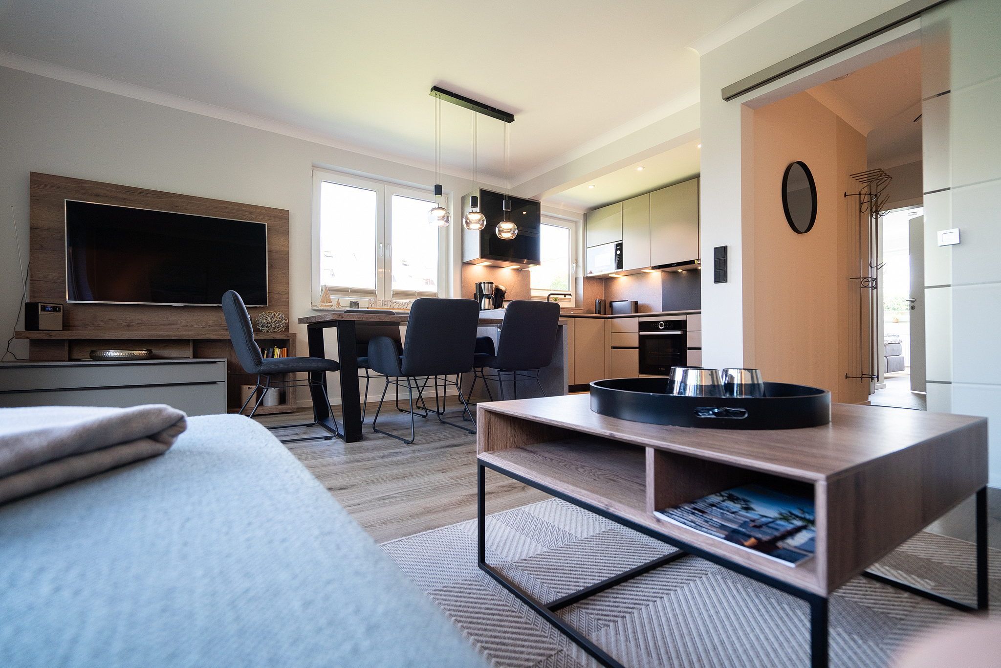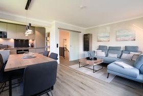 Die neue Küche wurde modern und sehr komfortabel ausgestattet: geräumiger Kühlschrank mit Gefrierfach, Backofen, Mikrowelle, Induktions-Kochfeld, Flachhaube, Geschirrspülmaschine und Kaffeemaschine. Am Esstisch können bis zu 5 Personen bequem Platz nehmen. Im Wohnbereich lädt das Stoff-Ecksofa zum Relaxen ein. Zu Ihrer Unterhaltung steht ein großer 55 Flachbildschirm-TV und ein Radio zur Verfügung. Der gesamte Bereich wurde durchgängig mit einem pflegeleichten, modernen Designboden ausgelegt.