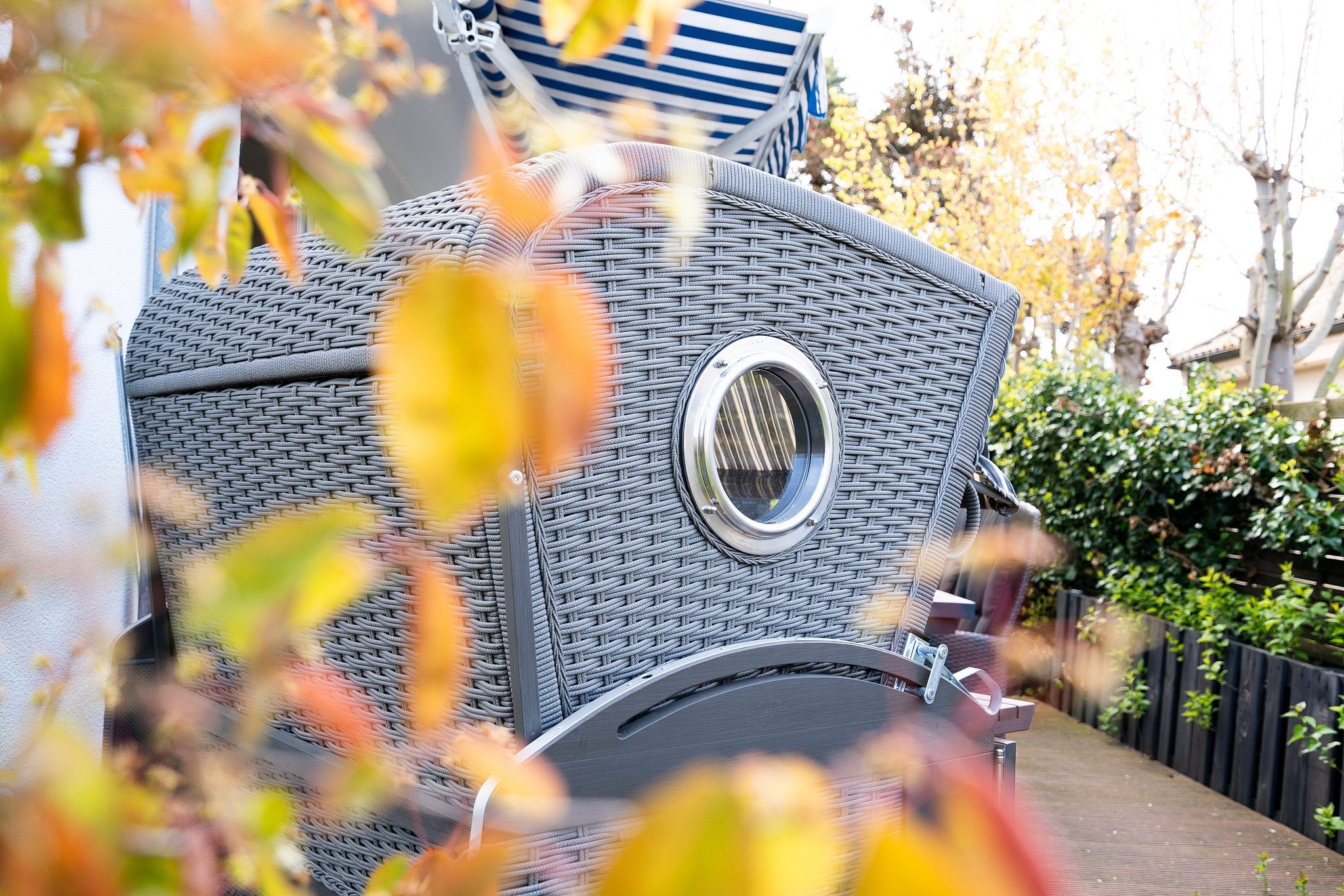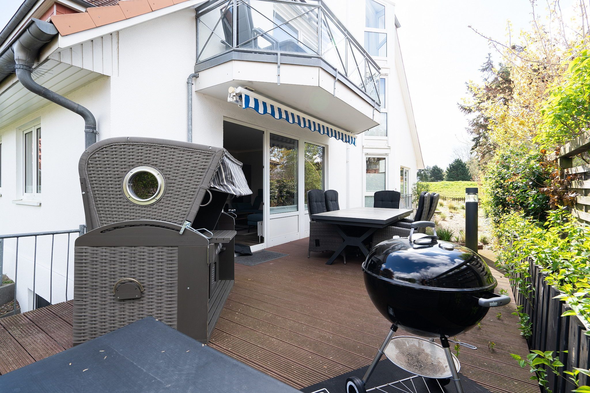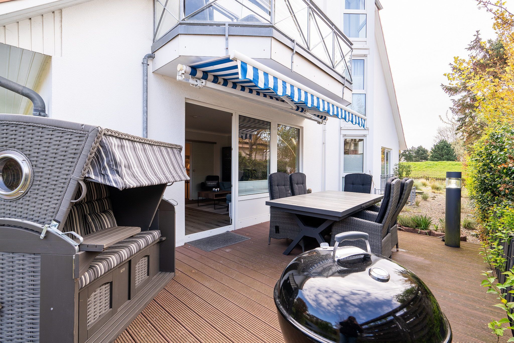 Vom Wohn-Essbereich haben Sie direkten Zugang zur großen Terrasse, in westlicher Richtung, die ebenfalls mit viel Komfort ausgestattet wurde: großer Tisch mit Holzkeramikplatte, Rattan Stühle mit verstellbaren Rücklehnen, Markise sowie einen Standkorb. Hier können Sie Ihren Urlaubstag ganz entspannt starten oder in der Abendsonne ausklingen lassen. Gönnen Sie sich diese Oase der Entspannung.
