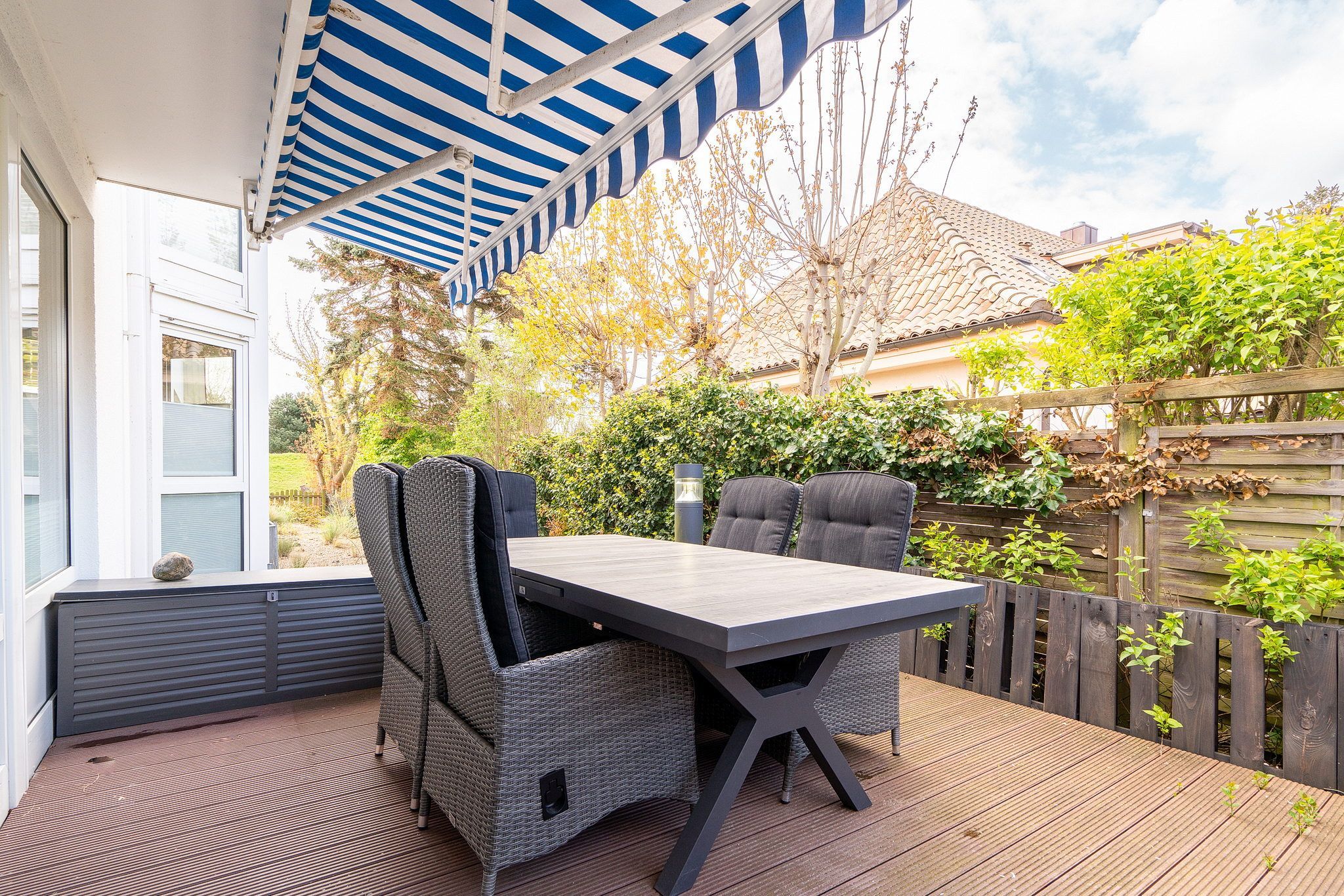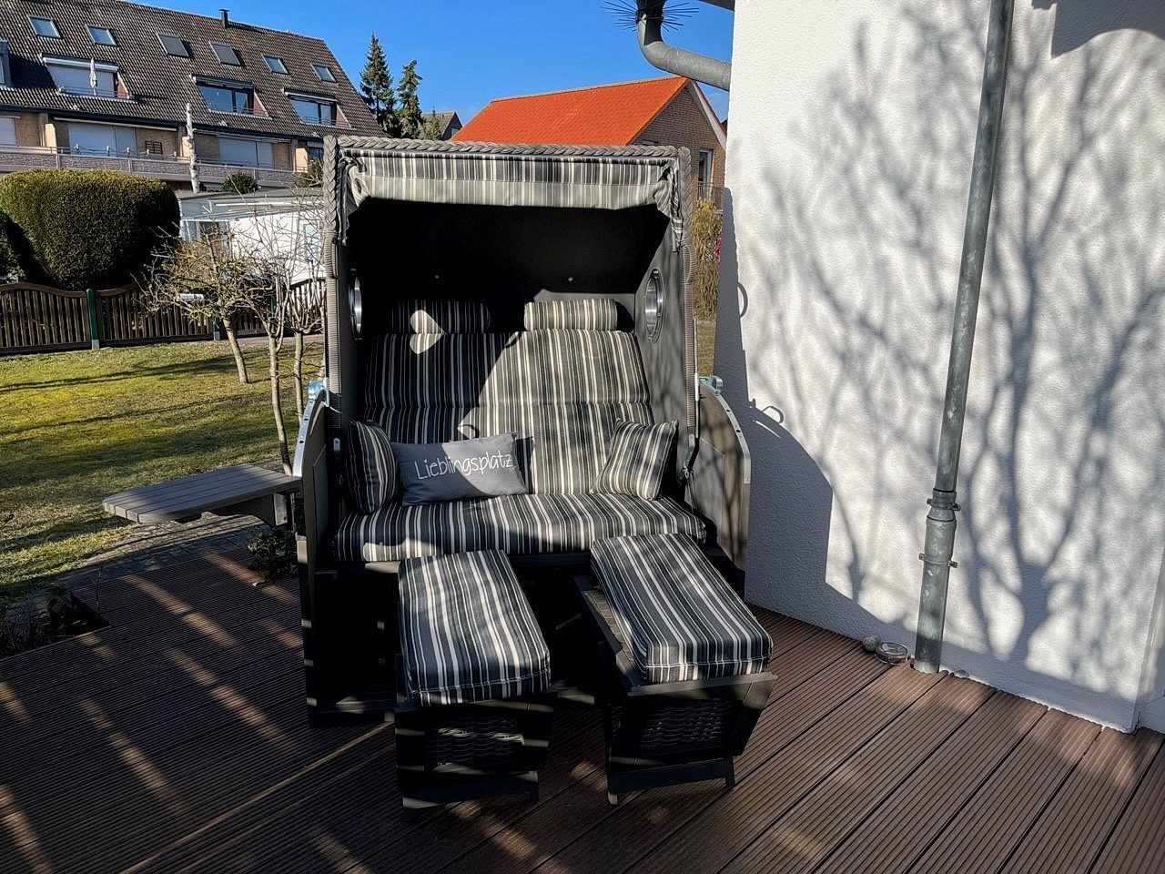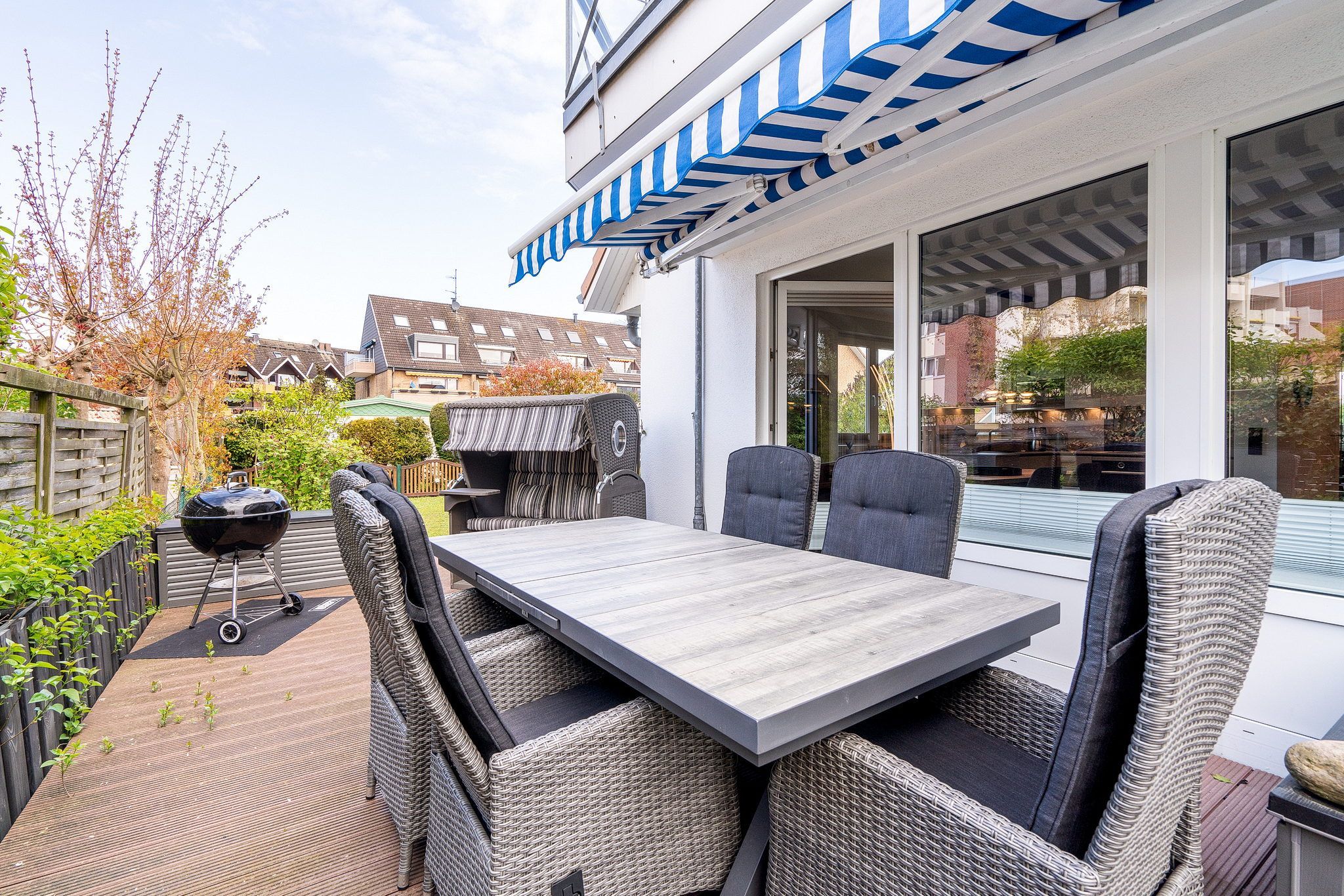 Vom Wohn-Essbereich haben Sie direkten Zugang zur großen Terrasse, in westlicher Richtung, die ebenfalls mit viel Komfort ausgestattet wurde: großer Tisch mit Holzkeramikplatte, Rattan Stühle mit verstellbaren Rücklehnen, Markise sowie einen Standkorb. Hier können Sie Ihren Urlaubstag ganz entspannt starten oder in der Abendsonne ausklingen lassen. Gönnen Sie sich diese Oase der Entspannung.