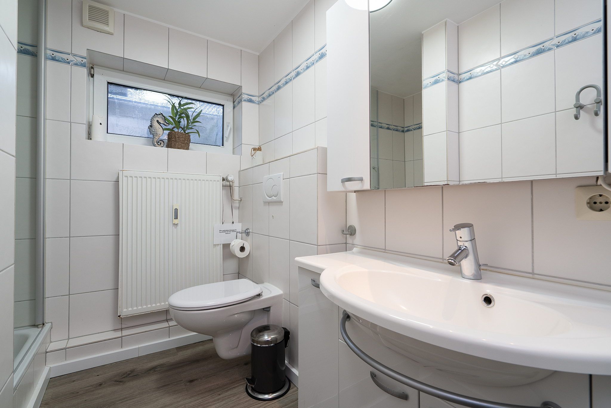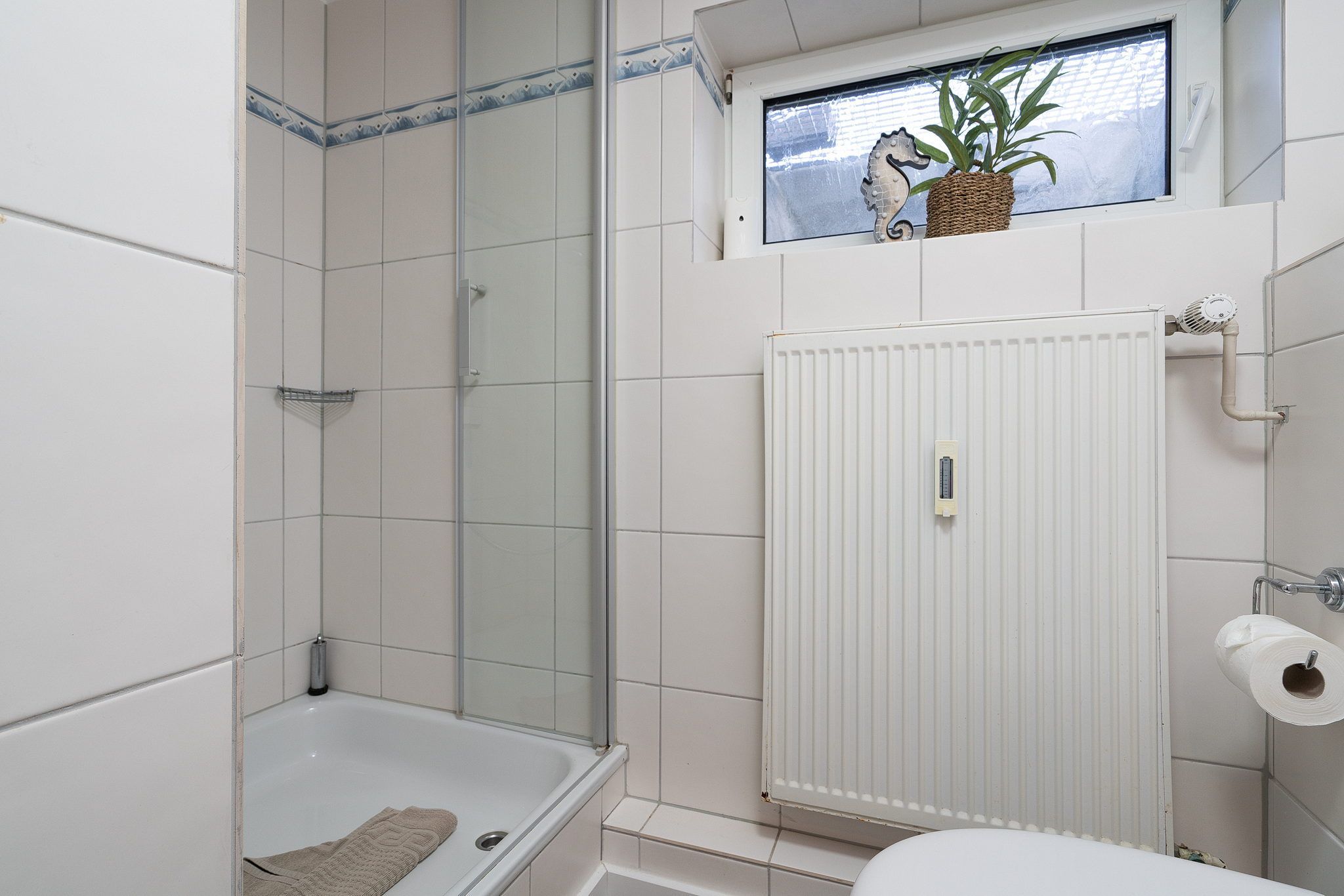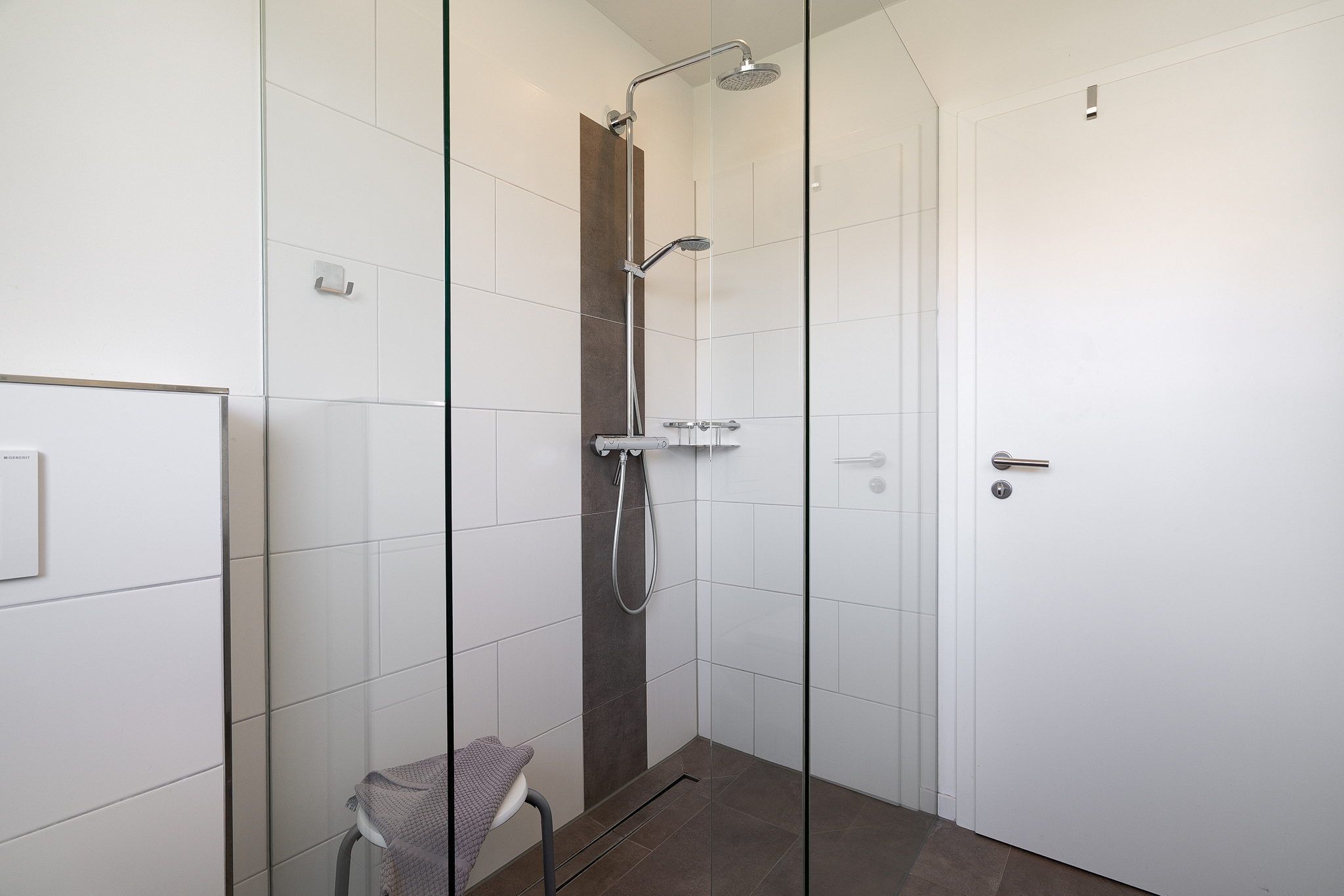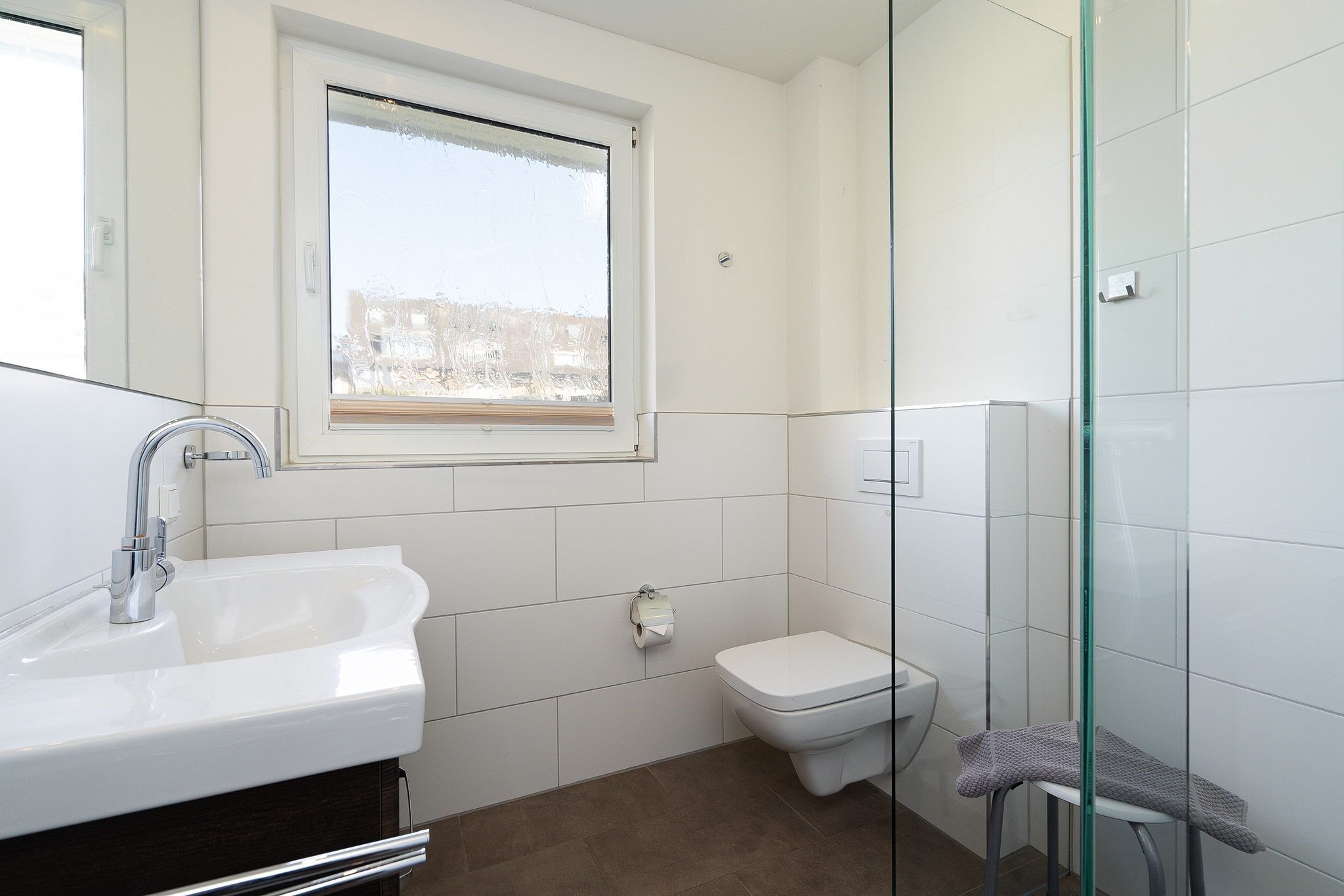 Das moderne gestaltete Tageslichtbad verfügt über eine geräumige und ebenerdige Dusche, WC und Waschtischanlage mit großem Wandspiegel.