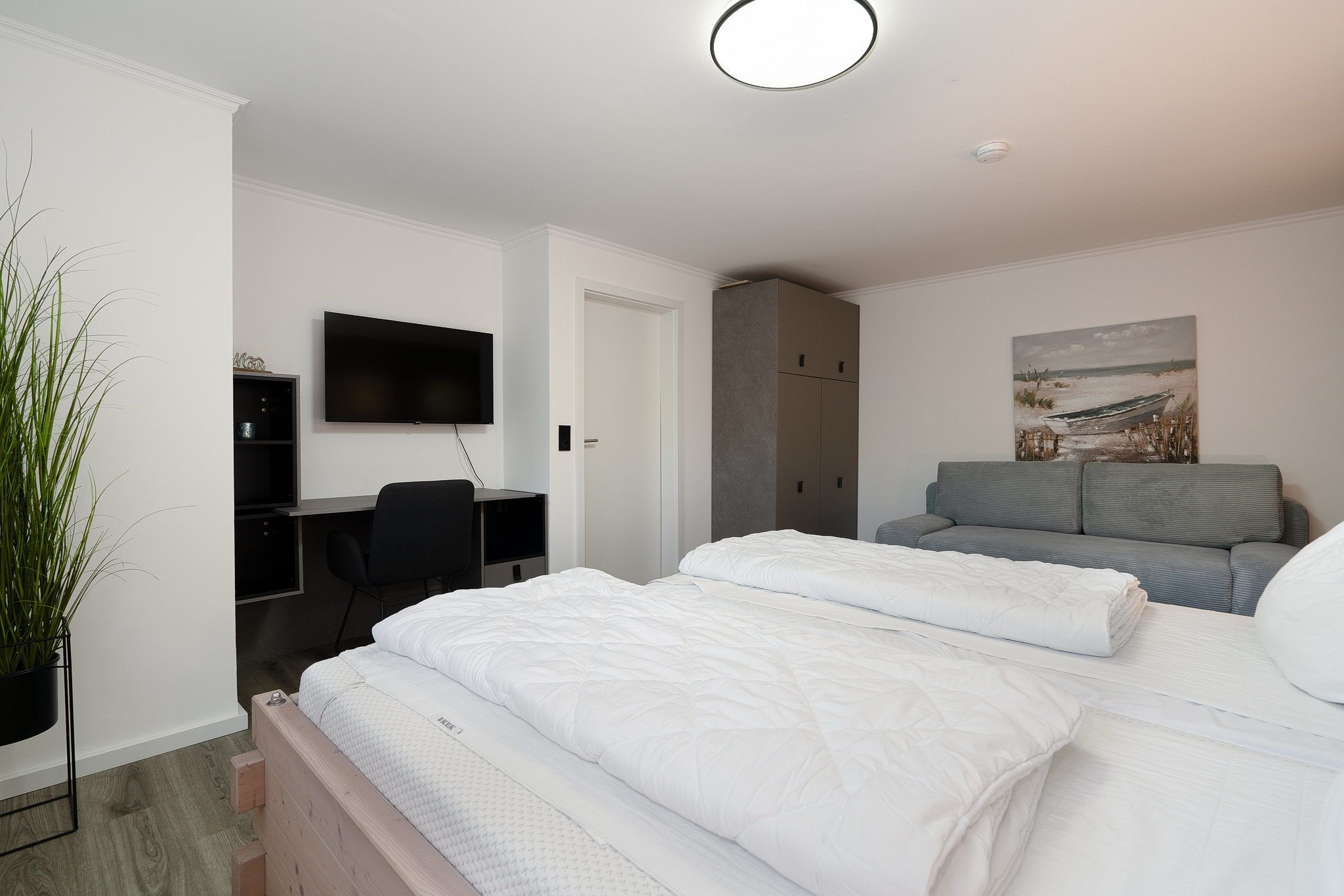 Das modern ausgestattete Schlafzimmer wurde mit einem neuen Boxspringbett (180x200cm) ausgestattet und verfügt über einen Kleiderschrank mit platzsparenden Schiebetüren. Der Raum wurde ebenfalls mit dem pflegeleichten, modernen Designboden ausgelegt. Die Fenster lassen sich durch die Plissees verdunkeln.