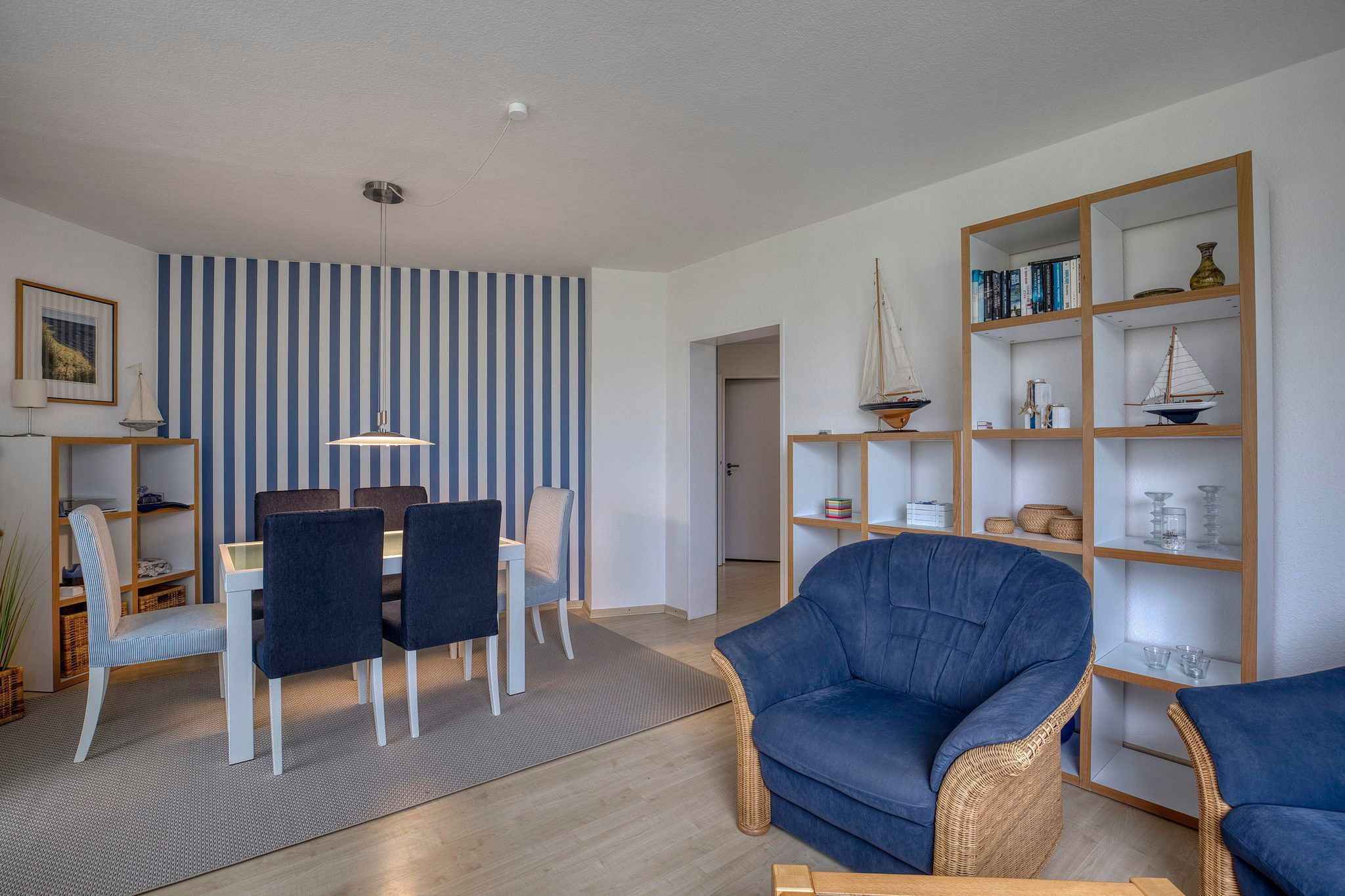 Gemütliches, helles, gepflegtes, Wohnzimmer mit Seeblick und Zugang zum Balkon. Im Wohn-/Esszimmer befindet sich ein großer Esstisch mit Platz für 6 Personen, eine Couch (3-Sitzer), ein Sessel, ein Couchtisch und ein Fernseher. Das Wohn-/Esszimmer ist mit Laminat ausgelegt.
