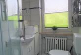 Modernes helles Tageslichtbad mit Dusche, Waschbecken und WC.