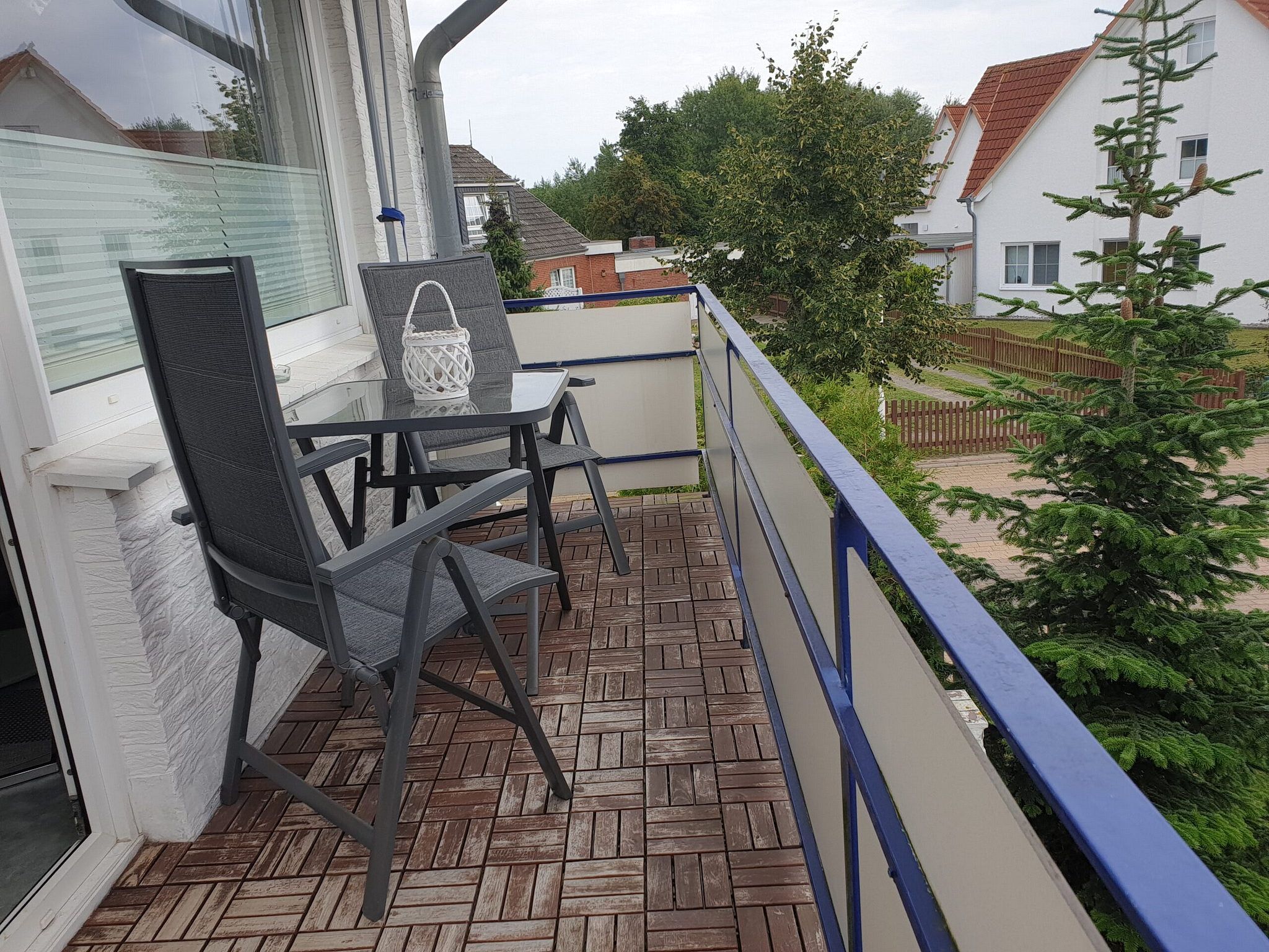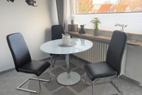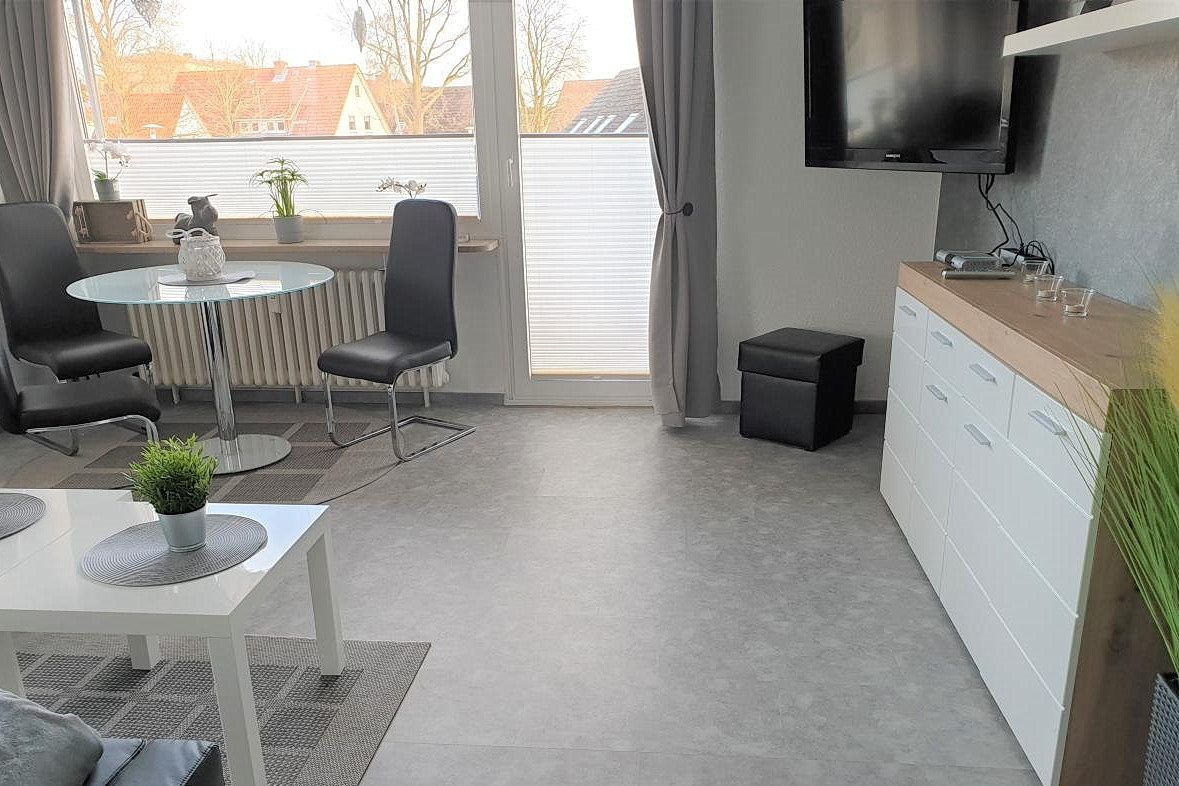 Lichtdurchflutetes Wohnzimmer mit sonnigem Süd-Balkon. Das Zimmer ist ausgestattet mit einer Schlafcouch, einem Couchtisch, einer Kommode und einem Esstisch mit 3 Stühlen. Zur Unterhaltung stehen ein Flachbild-TV (Kabelanschluss) und eine Stereoanlage zur Verfügung. Der Raum ist mit Vinylboden ausgelegt. Die Fenster lassen sich durch Vorhänge verdunkeln