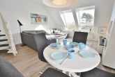 Gepflegte, zum Wohn- und Esszimmer offene, komplett ausgestattete Küchenzeile mit 4 Platten Cerankochfeld, Backofen, Spülmaschine, Kühlschrank mit kleinem 3-Sterne Gefrierfach, Toaster, Wasserkocher und Kaffeemaschine.