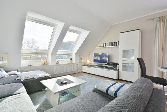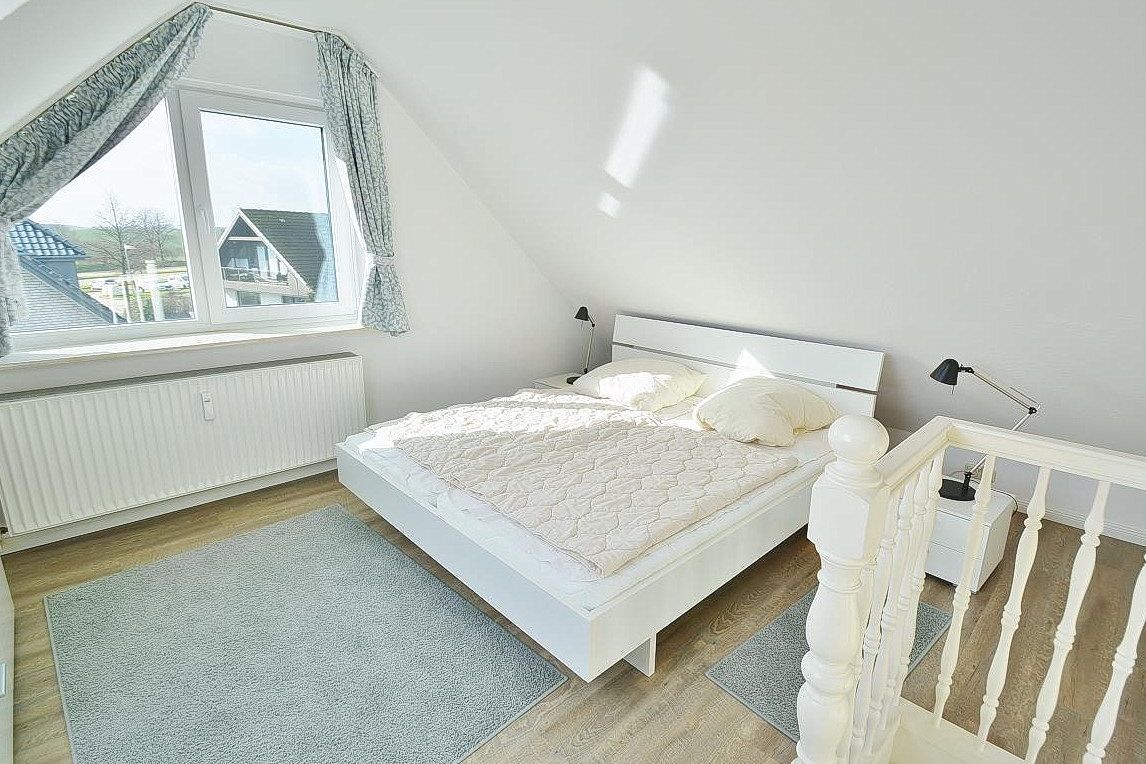 Das Schlafzimmer im 2. OG ist über eine Wendeltreppe erreichbar. Das Schlafzimmer ist mit einem Doppelbett (2x 90x200cm) und 2 Kommoden ausgestattet. Die Fenster lassen sich durch ein Innenrollo bzw. einem blickdichten Vorgang fast vollständig verdunkeln. Das Zimmer ist mit Vinylboden ausgelegt. Zur Unterhaltung steht ein Fernseher ( nur öffentlich rechtliche Sender) zur Verfügung.