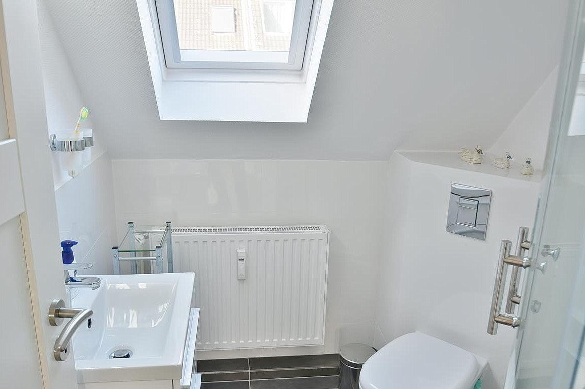 Baulich bedingt fällt das helle, freundliche Tageslichtbad eher klein und die Dusche schmal aus. Des Weiteren verfügt das Bad über ein WC und ein Waschbecken.