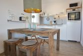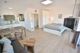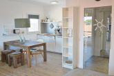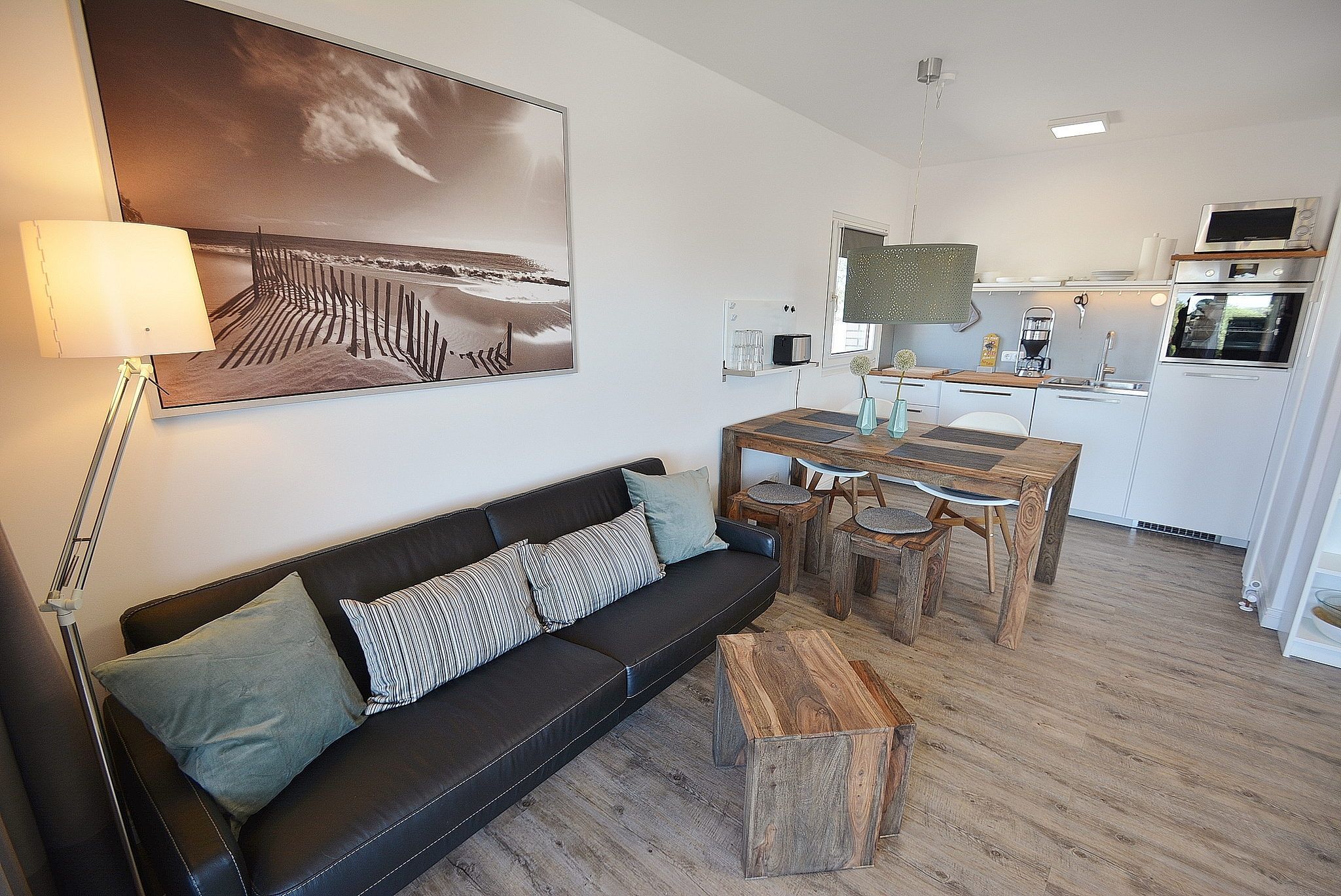Moderne, komplett eingerichtete, zum Wohnbereich offene Küche. Die Küche ist mit einem Ceran- Kochfeld, einer Spülmaschine, einem Wasserkocher, Toaster, Kaffeemaschine, einem Kühlschrank und einer Mikrowelle ausgestattet.