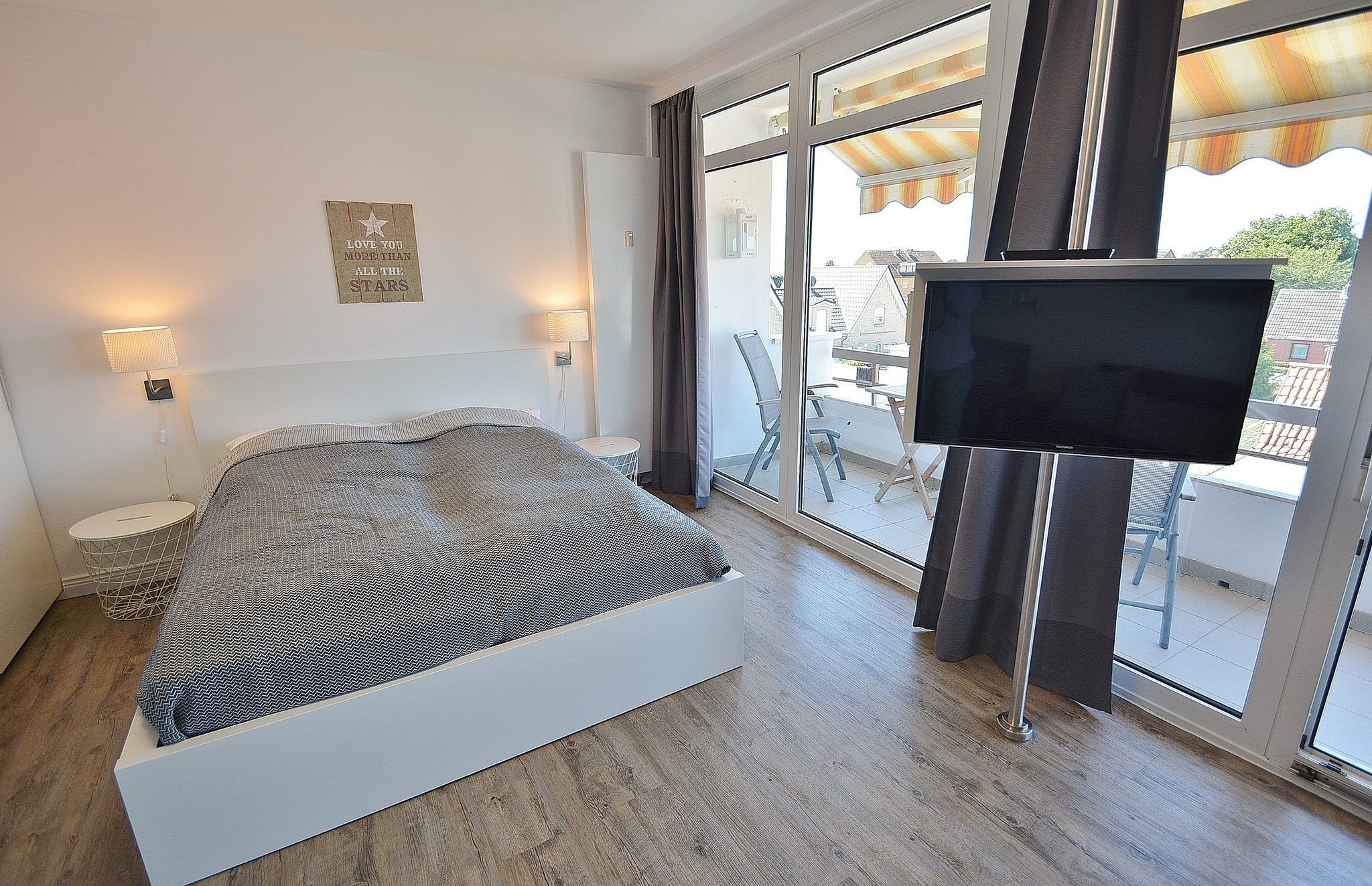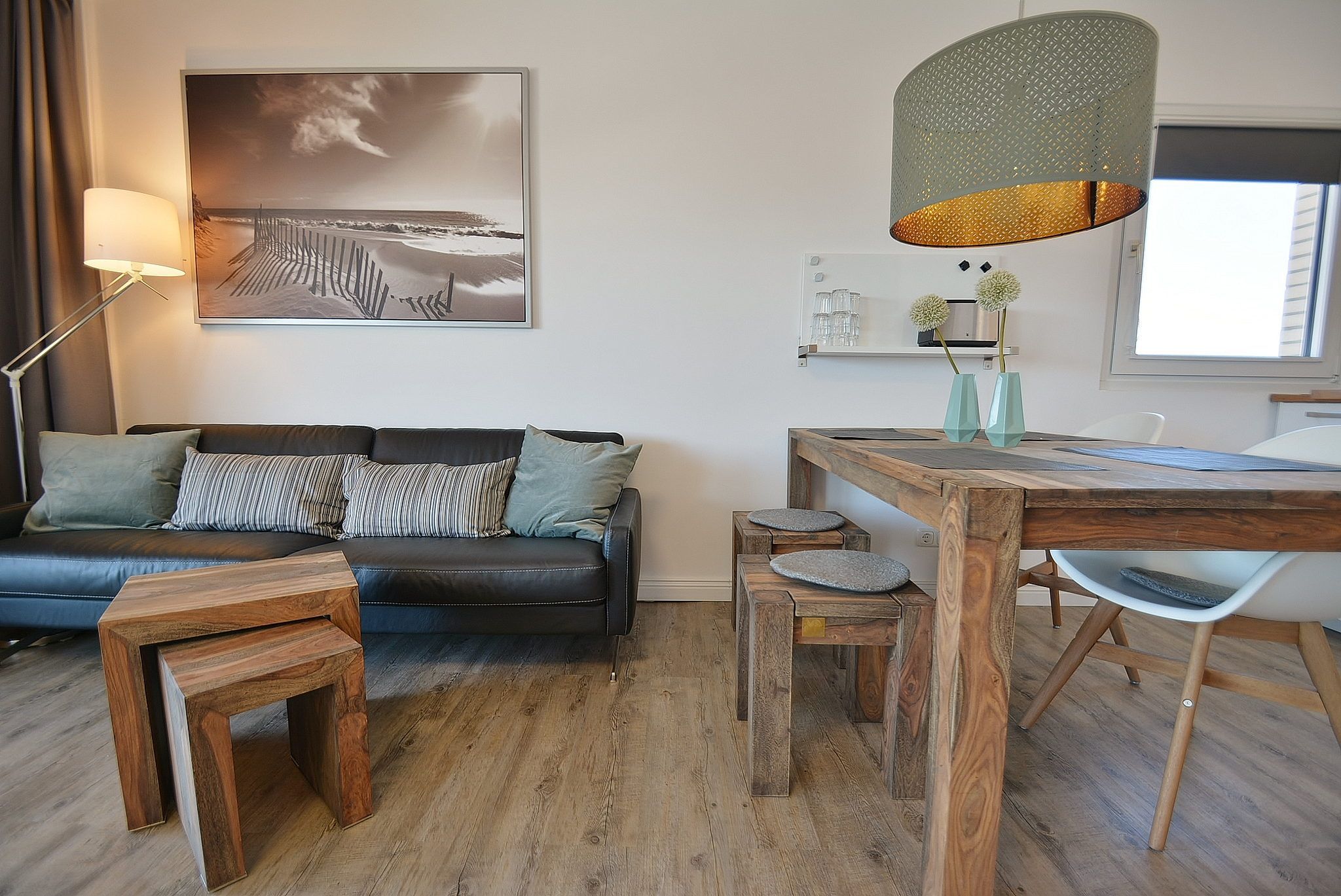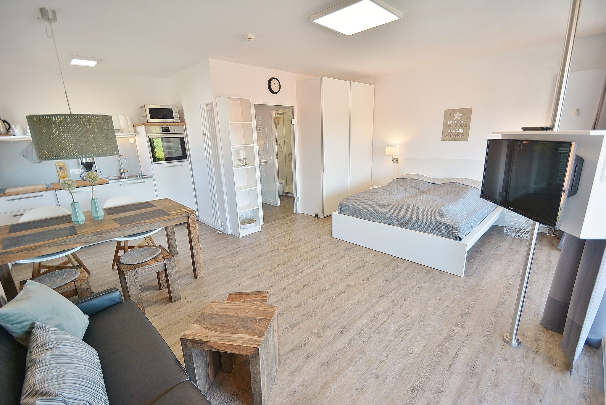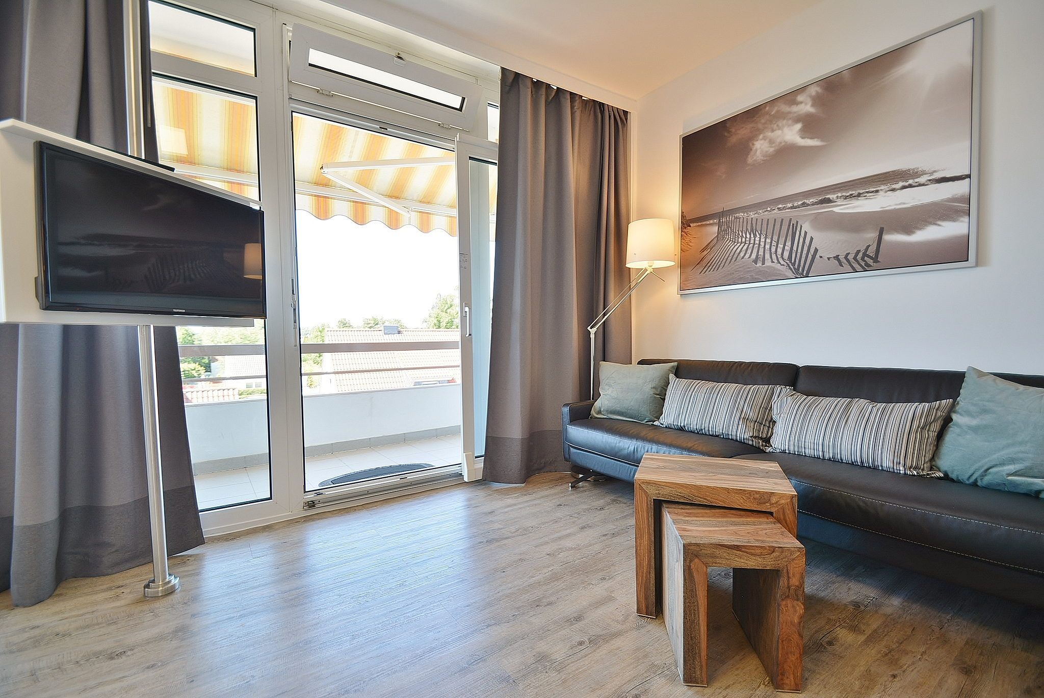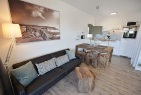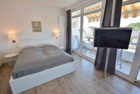 Moderner, freundlicher und heller Wohnbereich mit direktem Zugang zum Balkon. Der Wohnbereich ist mit einer Couch, einem Couchtisch, einem Essbereich für 4 Personen, einem Doppelbett und einem 2-türigem Kleiderschrank ausgestattet. Zur Unterhaltung steht ein Flachbildschirm zur Verfügung.