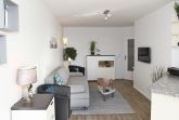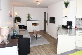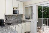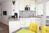 Zum Wohnzimmer offene Küchenzeile mit Kühlschrank, kleinem Gefrierfach, Spülmaschine, 2-Platten Cerankochfeld, ein kleiner mobiler Backofen und Mikrowelle. Des Weiteren stehen ein Toaster, eine Kaffeemaschine und ein Wasserkocher zur Verfügung
